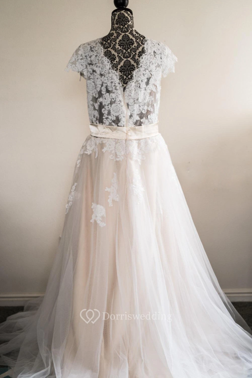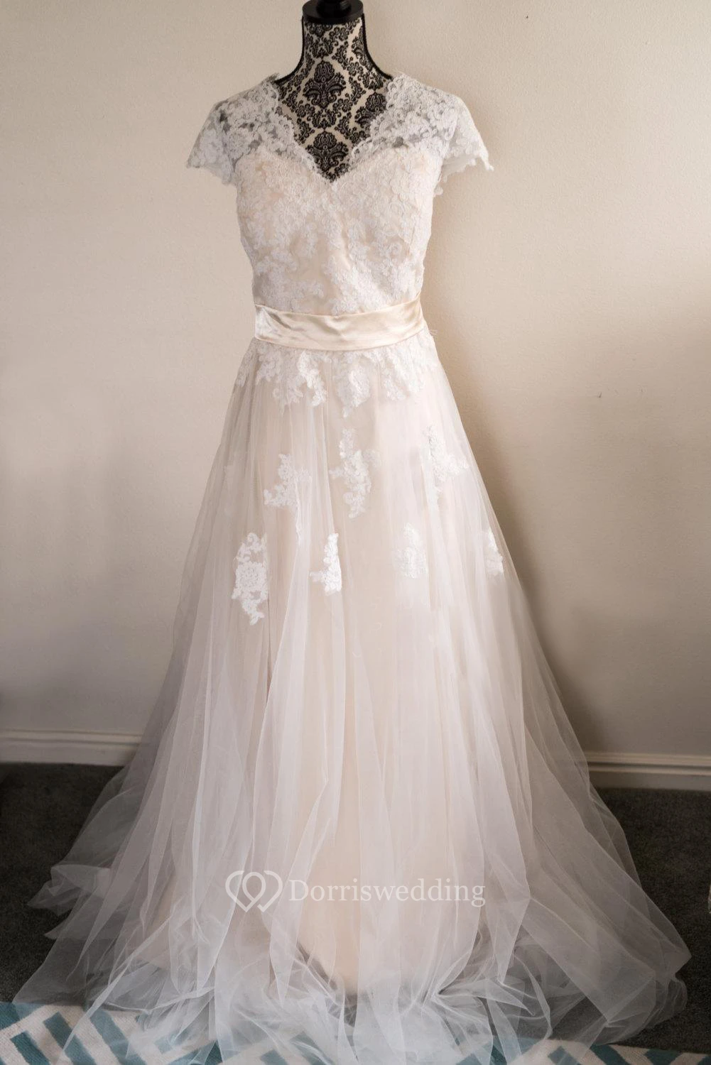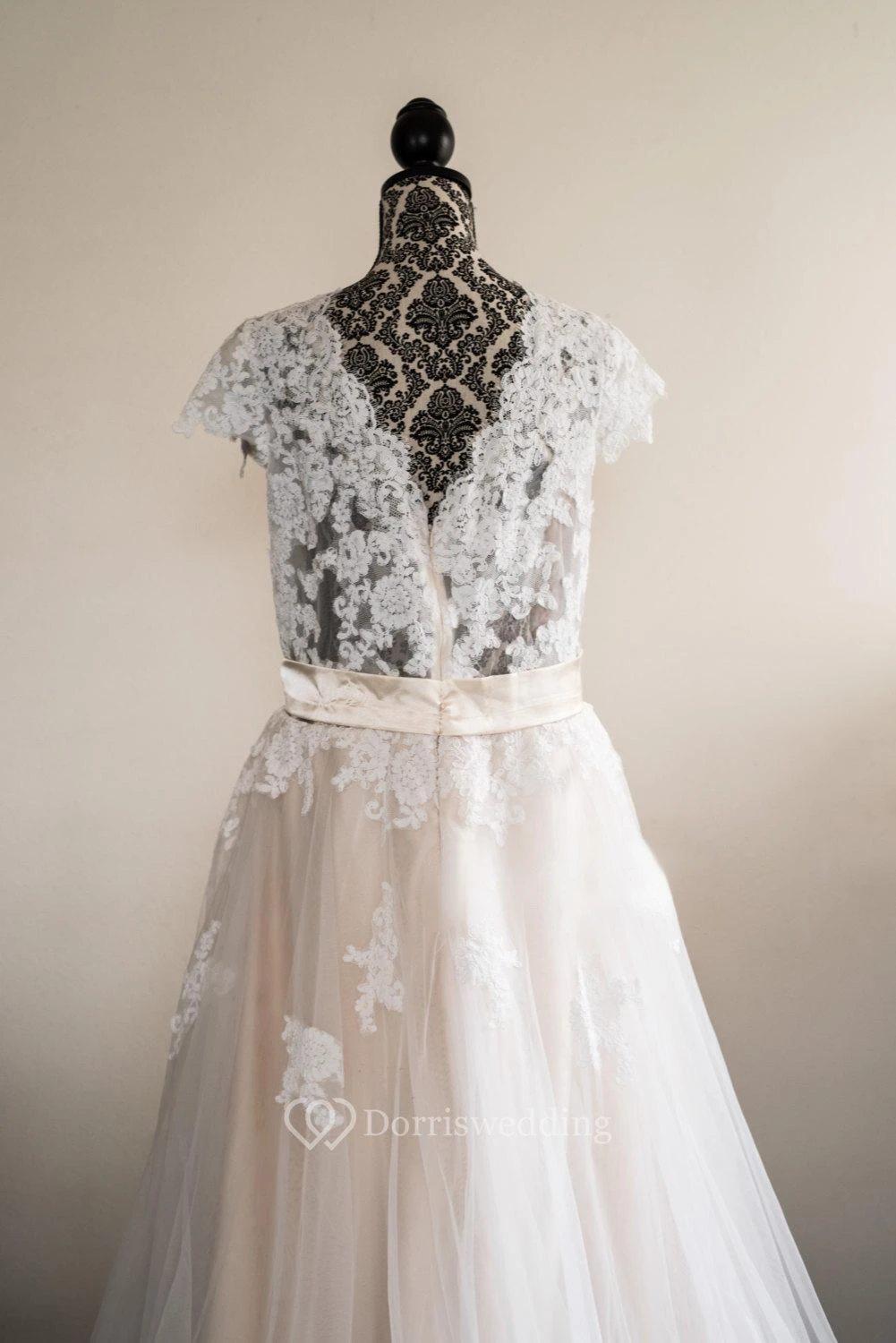 V-Neck Appliqued Tulle Skirt Lace Bodice Dress With Short Sleeves