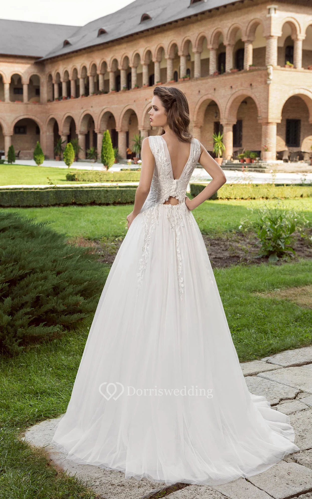 V-neck Appliques Empire Bridal Dress With Low V Back