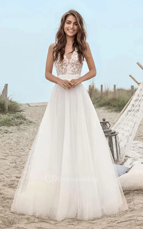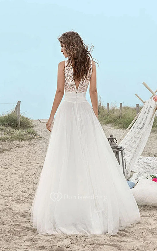 V-neck Beach A-line Tulle Destination Wedding Dress with Lace Top
