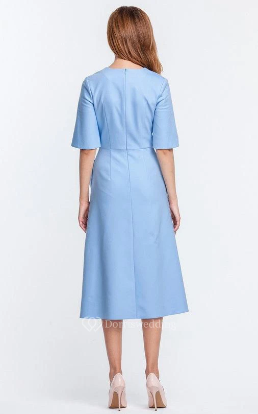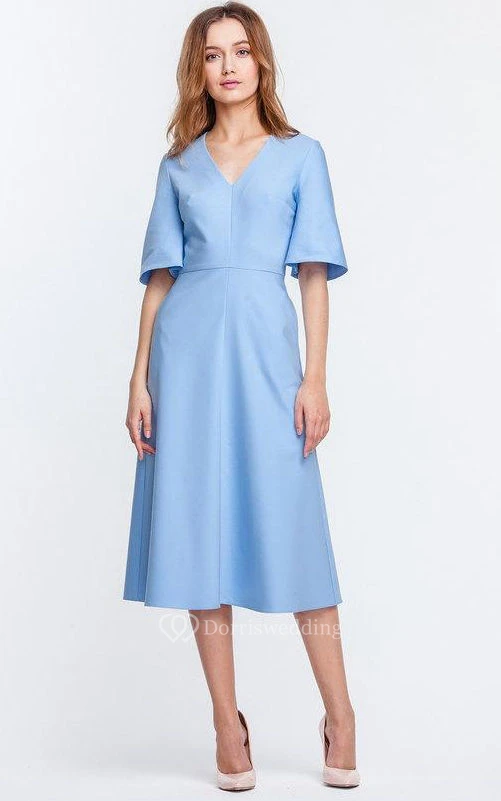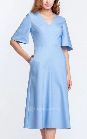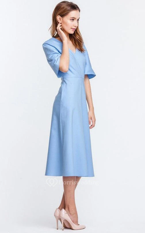 V Neck Bell Sleeve A-line Satin Knee Length Dress Blue