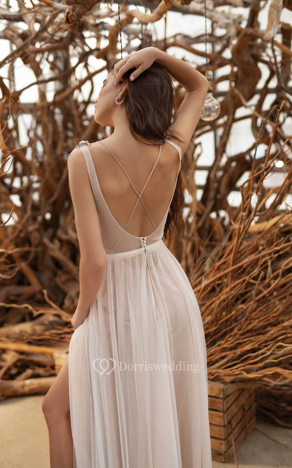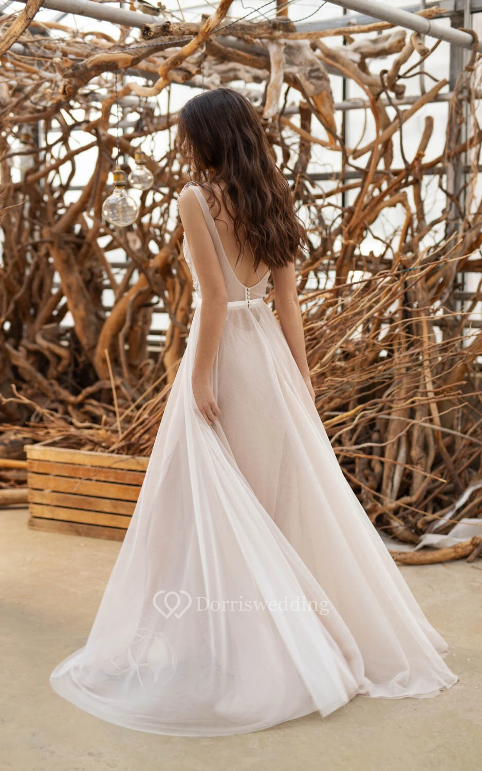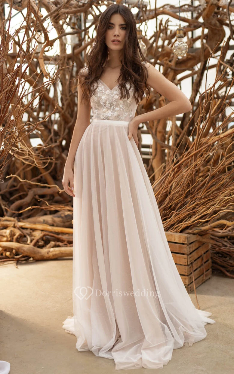 V-neck Cap Beaded Empire Tulle A-line Wedding Dress with Applique