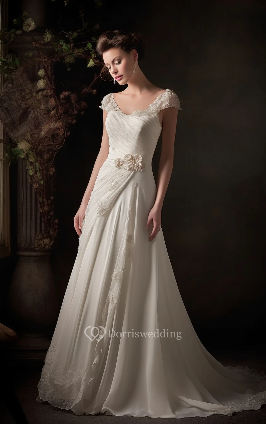 V-neck Cap Empire Chiffon Ruched Draped Wedding Dress with Tiers