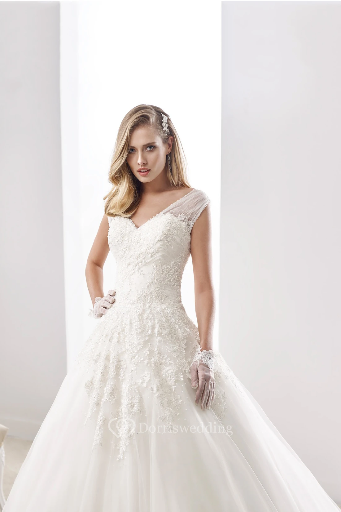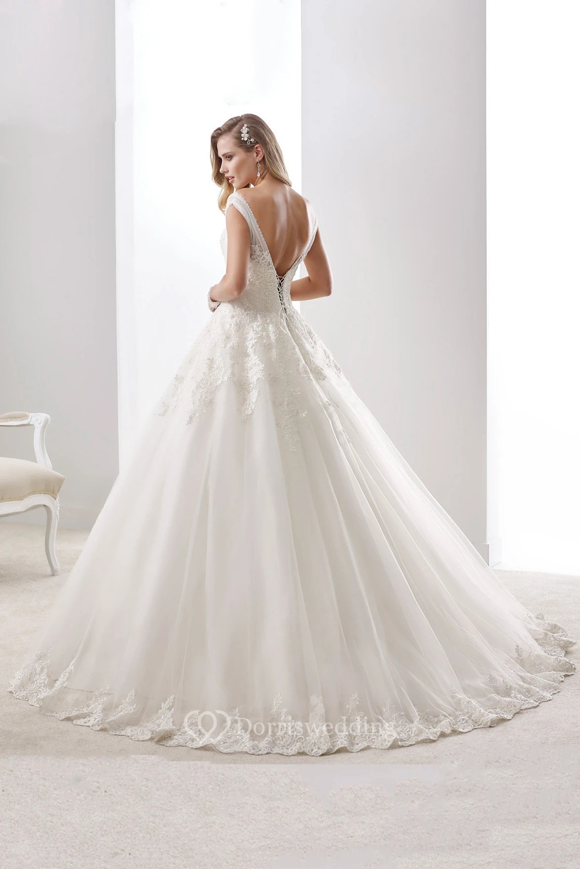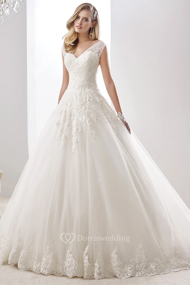 V-neck Cap sleeve A-line Wedding Dress with Open Back and Tulle Straps