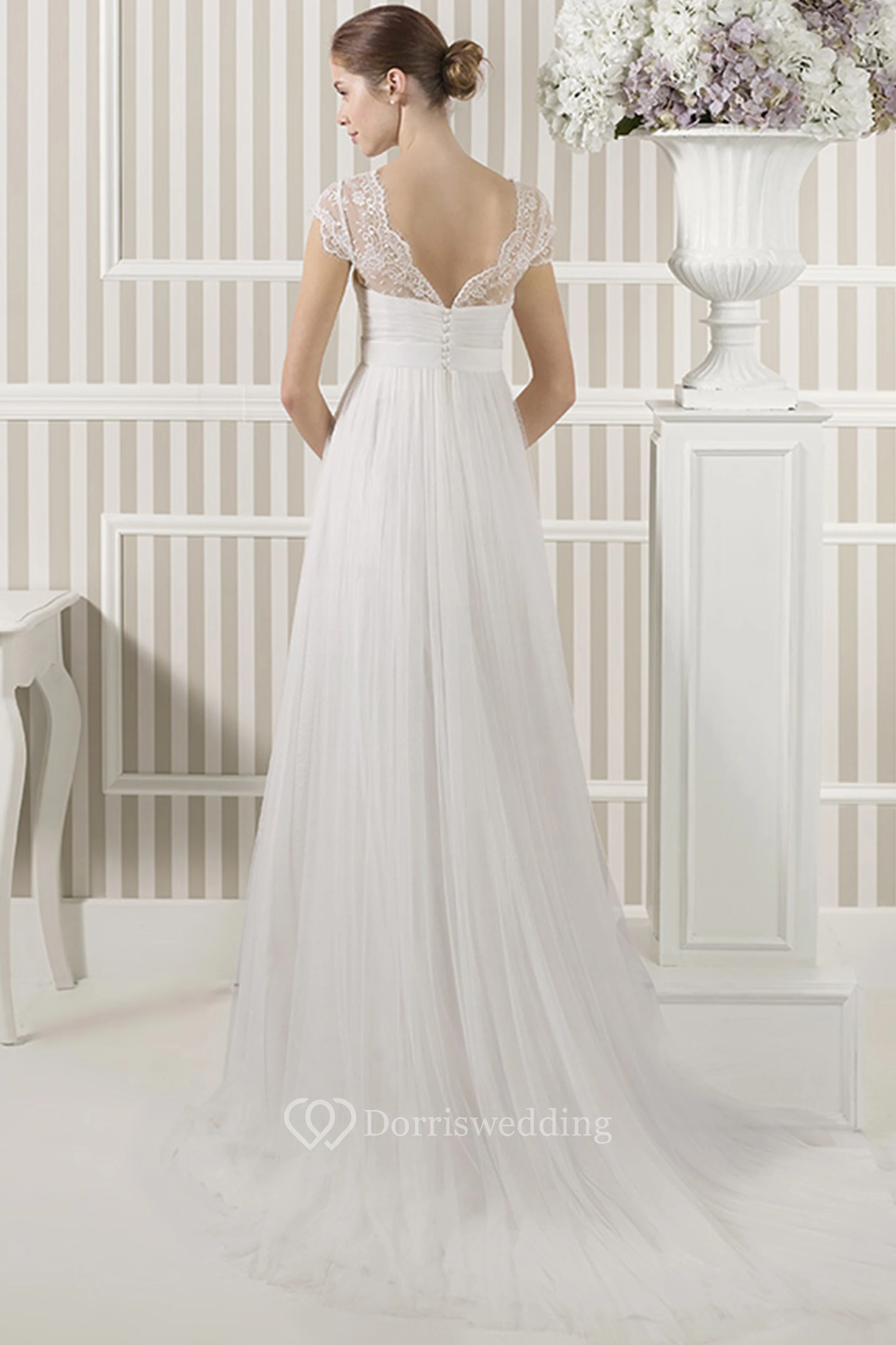 V-Neck Cap Sleeve Appliqued Empire Tulle Lace Wedding Dress