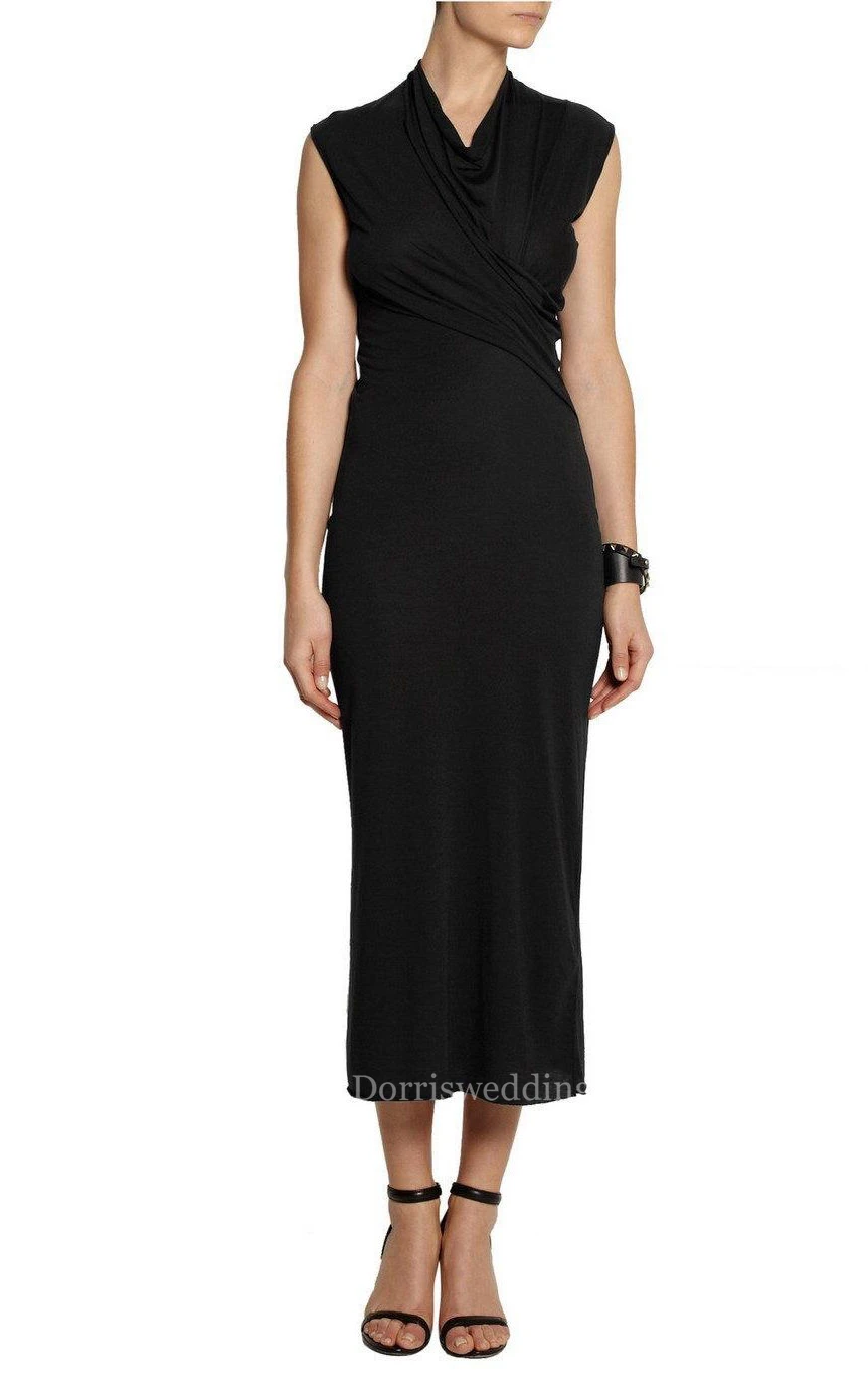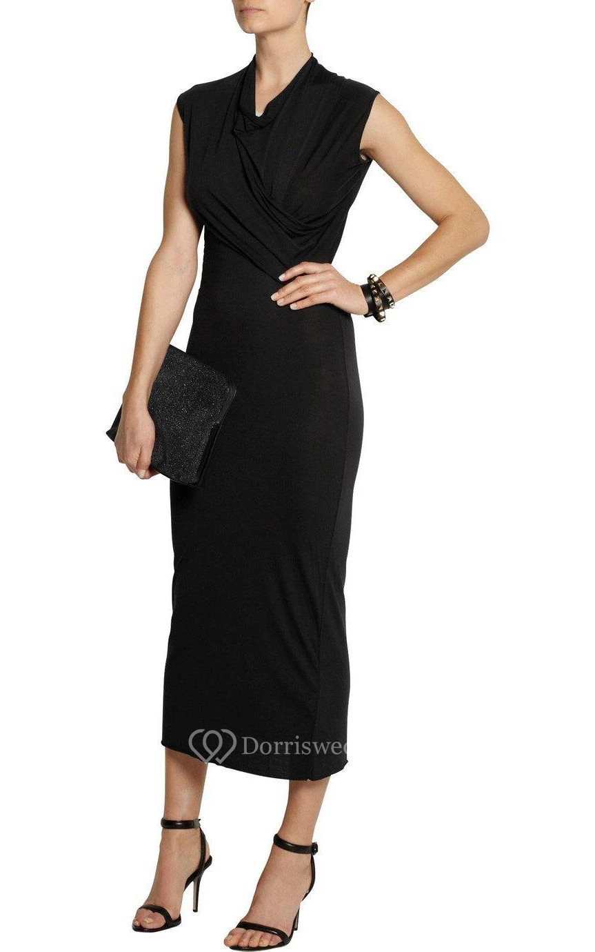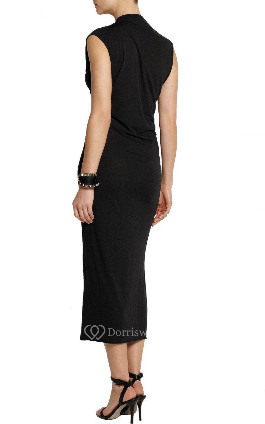 V Neck Cap Sleeve Sheath Jersey Tea Length Dress With Ruching
