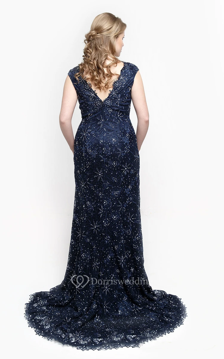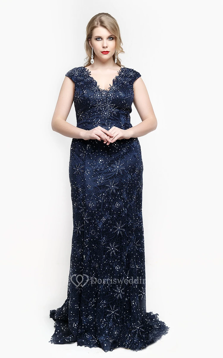 V Neck Cap Sleeve Sheath Lace Long Dress With Beading And Appliques