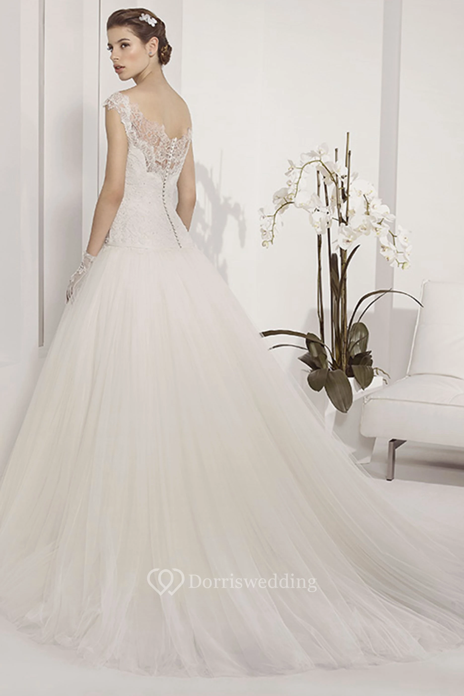 V Neck Cap Sleeve Tulle Ball Gown With Wrop Waist And Flower