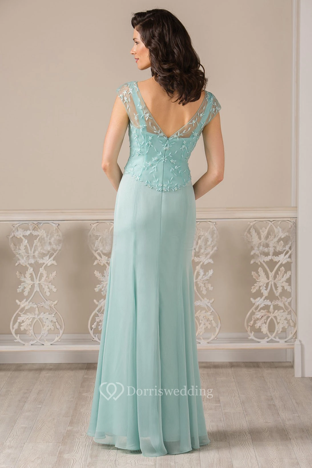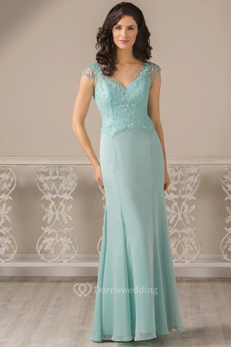 V-Neck Cap-Sleeved Long Mother Of The Bride Dress With Pleats And Appliques
