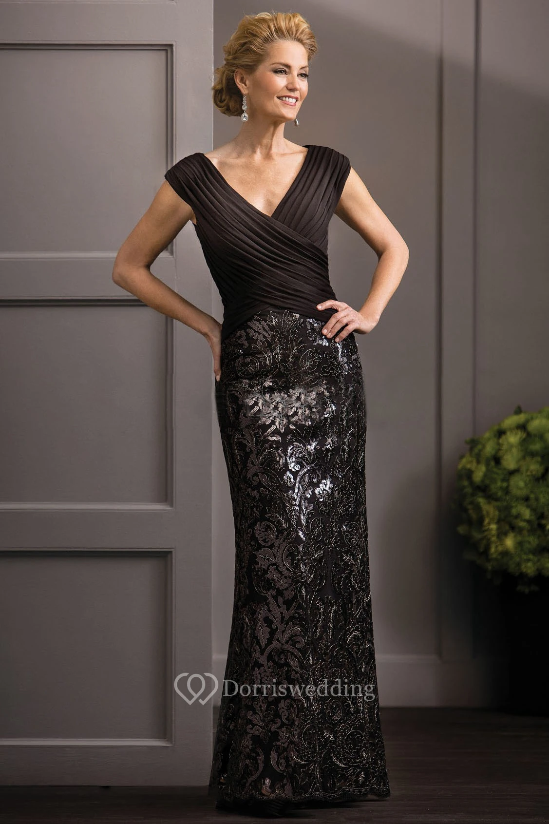 V-Neck Cap-Sleeved Mother Of The Bride Dress With Crisscross Ruches And Sequins