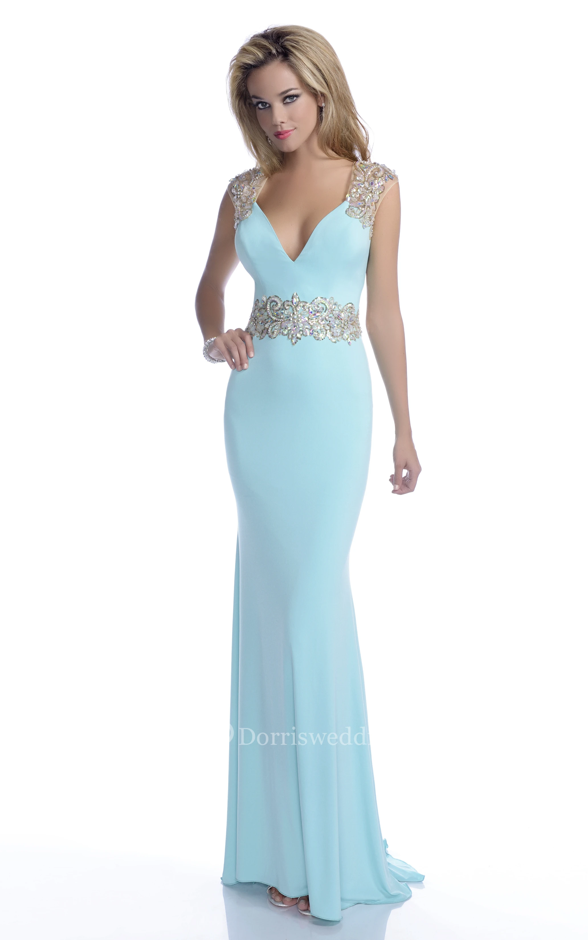 V-Neck Chiffon Mermaid Illusion Back Sleeveless Prom Dress With Sequined Straps And Belt