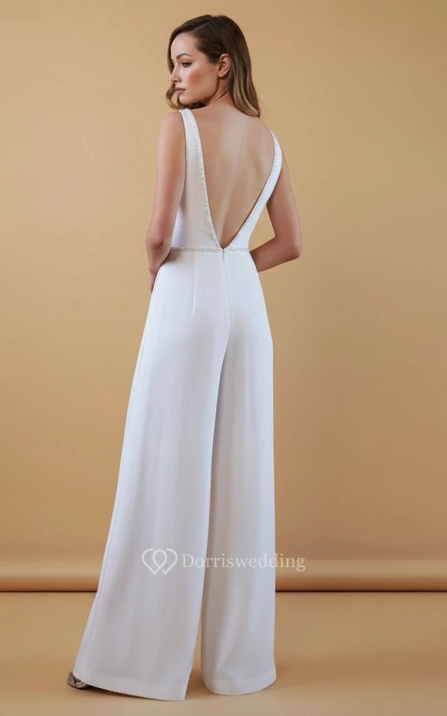 V-Neck Decorative Edge Sleeveless Wide Leg Wedding Jumpsuit
