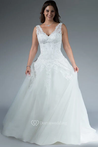 V Neck Drop Waist A-Line Tulle Bridal Gown With Applique Top And Crystal