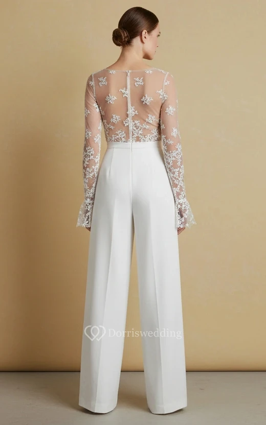 V-Neck Embroidered Sheer Long Sleeve Top High Waist Wedding Jumpsuit