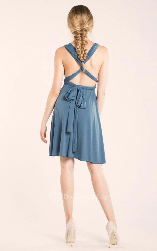 V Neck Empire Pleated A-line Knee Length Dress With Criss Cross Back