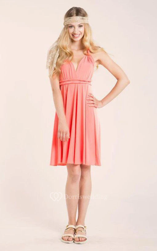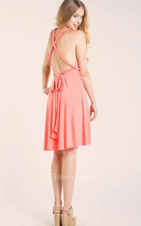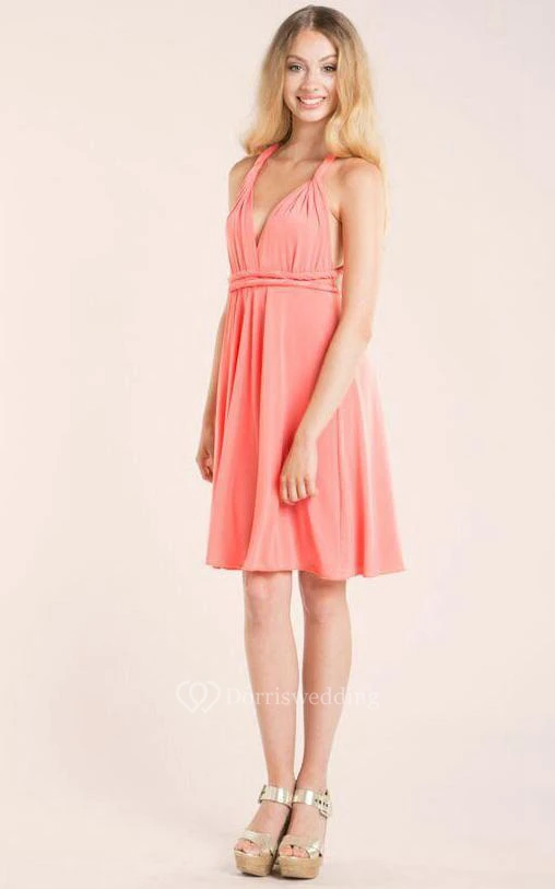 V Neck Empire Pleated A-line Knee Length Jersey Dress Criss Cross Back
