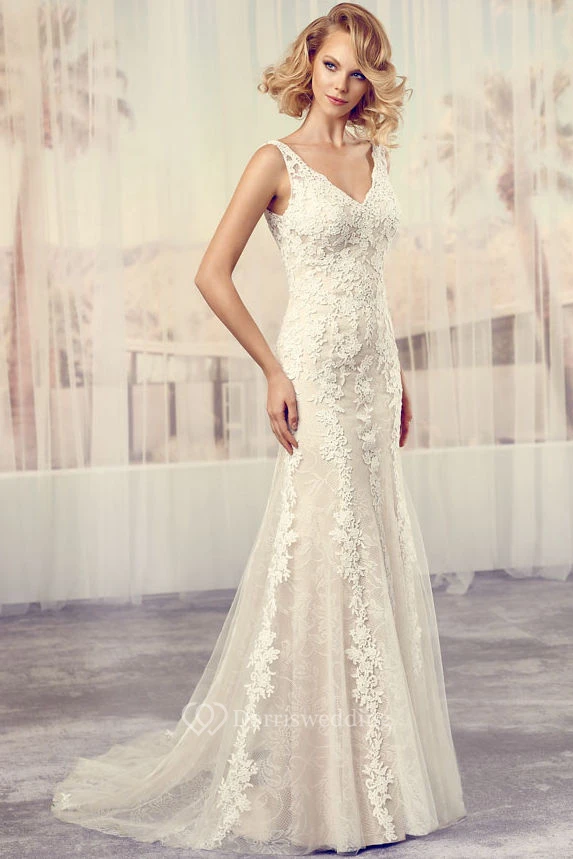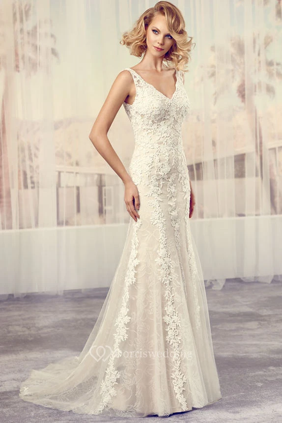 V-Neck Floor-Length Appliqued Lace Vintage Wedding Dress With Court Train And V Back
