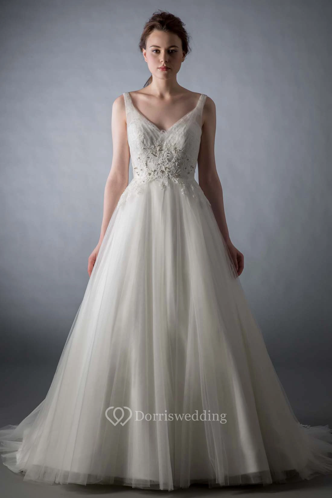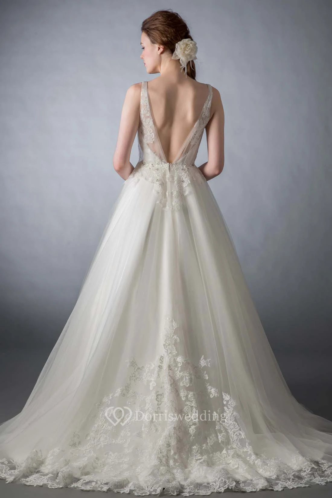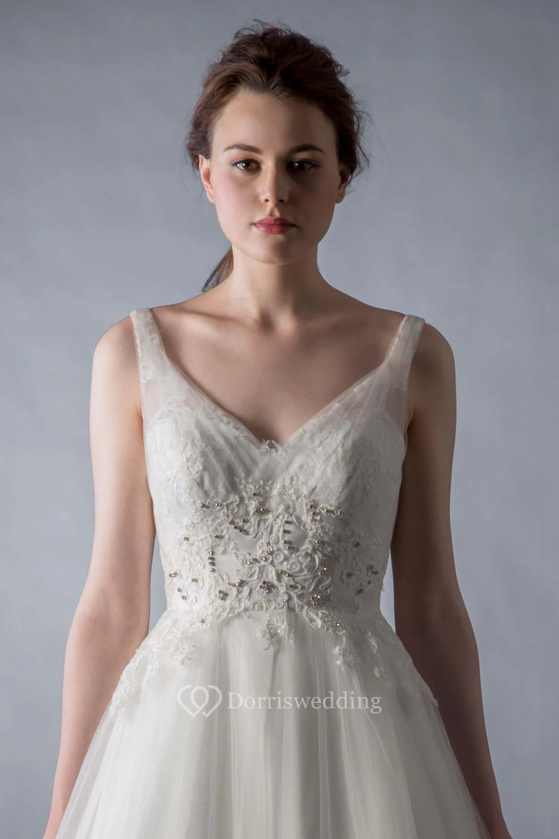 V-Neck Floor-Length Beaded Tulle Wedding Dress With Court Train And V Back