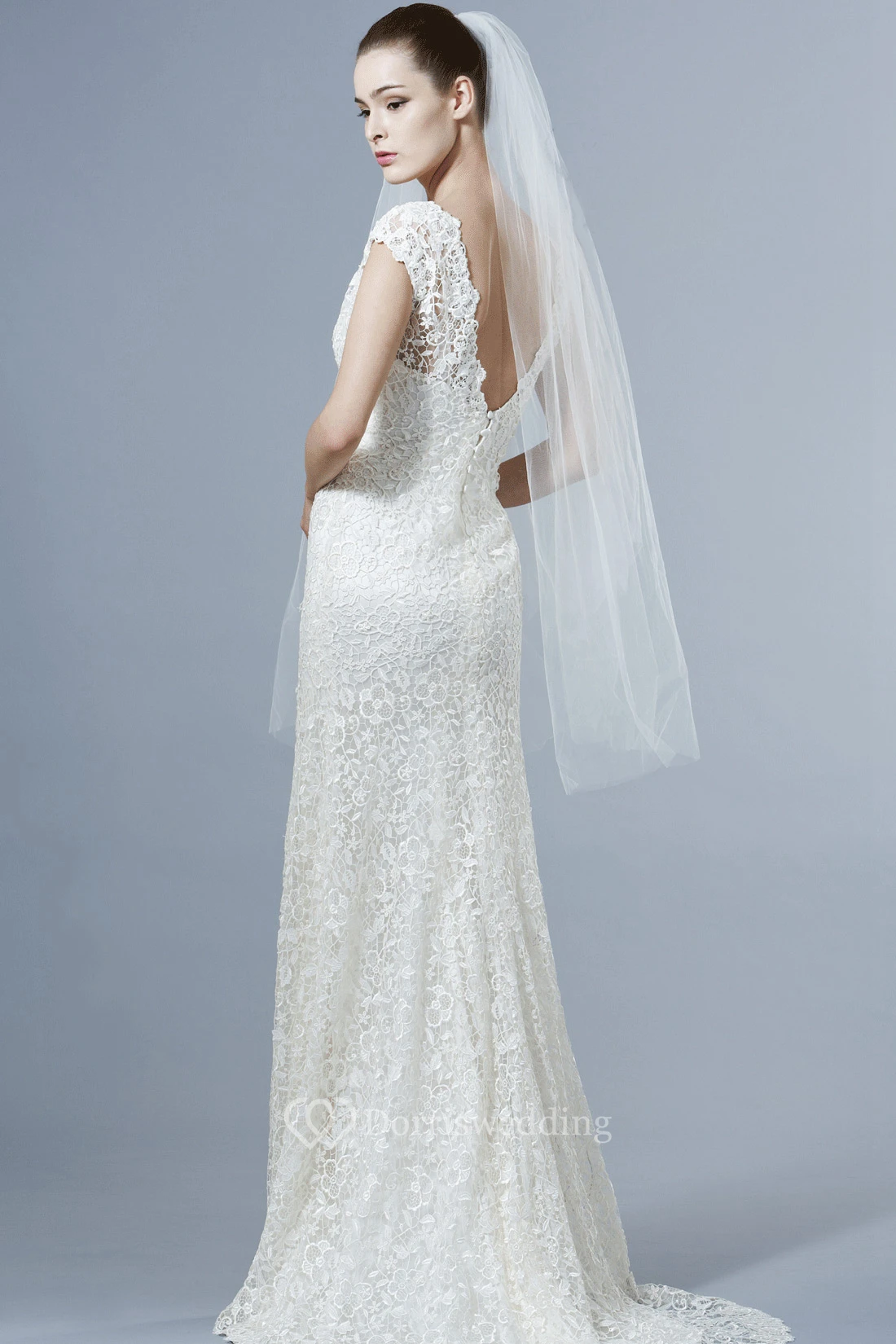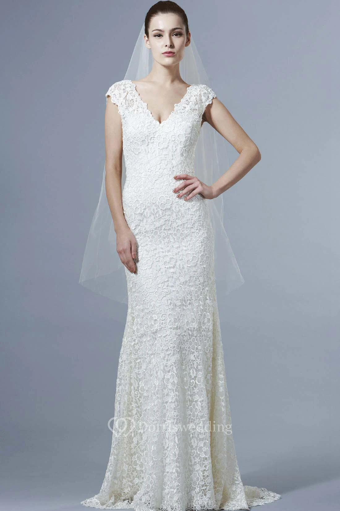 V-Neck Floor-Length Cap-Sleeve Lace Wedding Dress With Brush Train And V Back