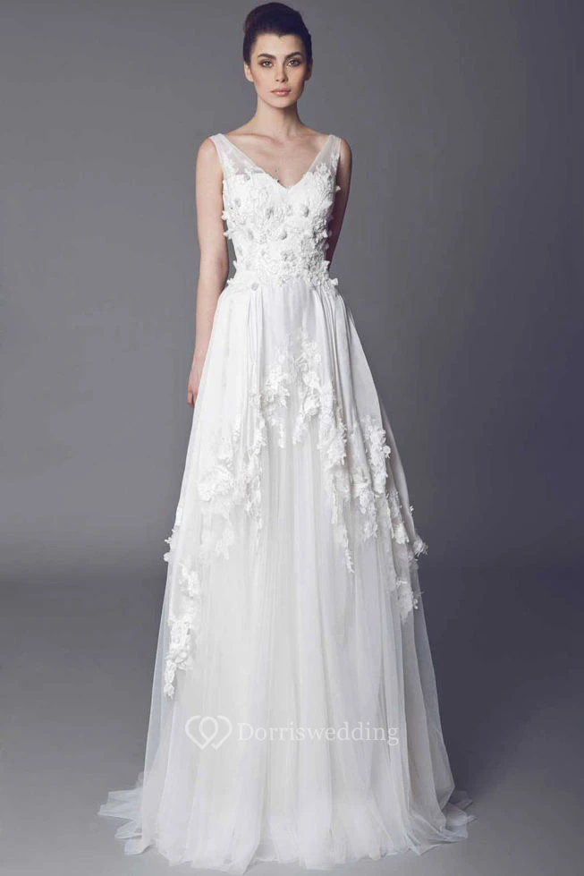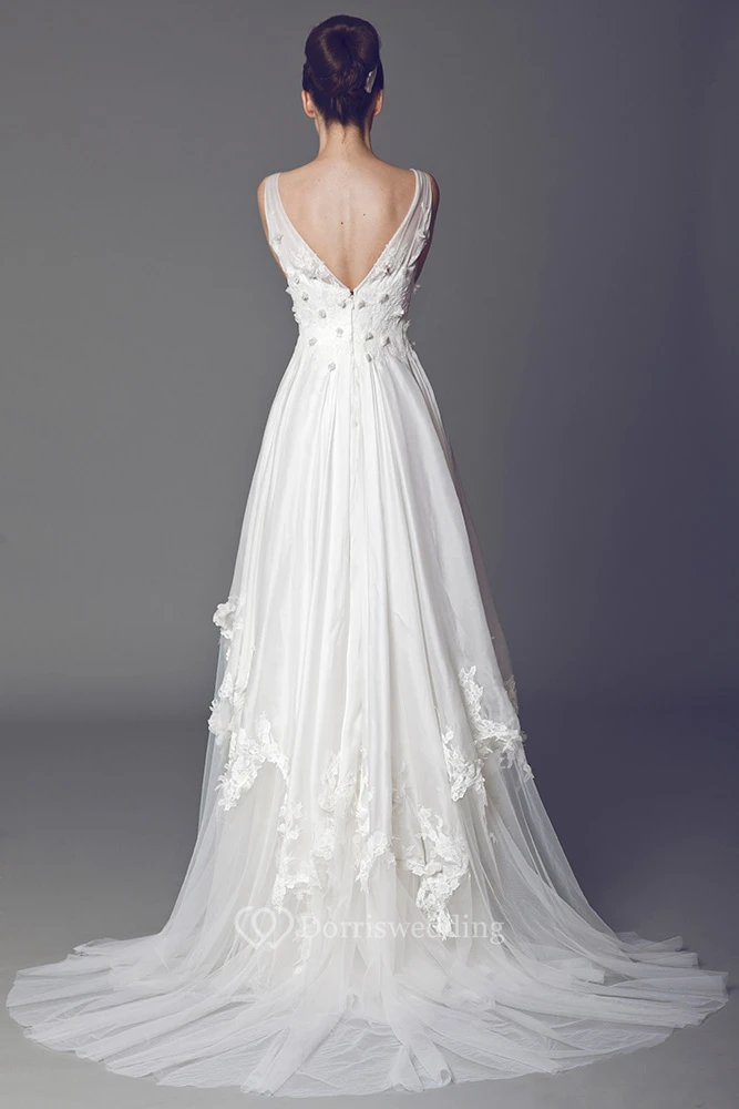 V-Neck Floor-Length Draped Appliqued Tulle Wedding Dress With Court Train And V Back