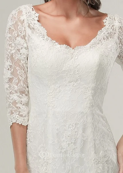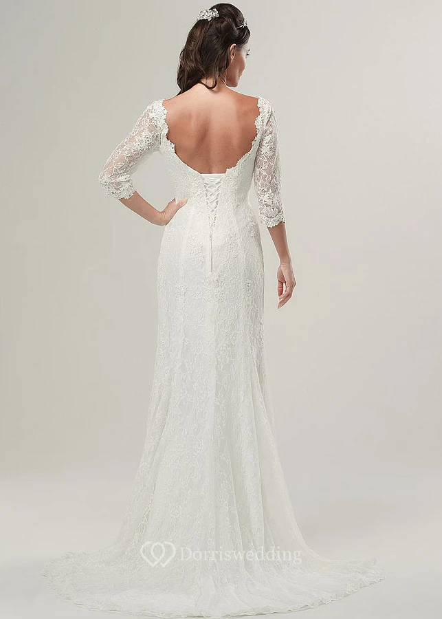 V-Neck Floor-Length Half Sleeve Lace Modest Wedding Dress With Brush Train And Lace Up