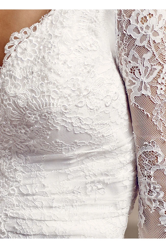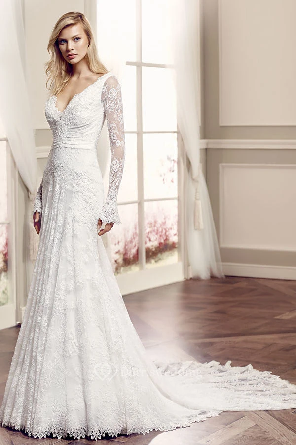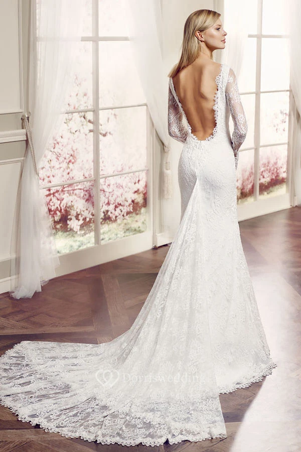 V-Neck Floor-Length Long-Sleeve Lace Wedding Dress With Watteau Train And V Back
