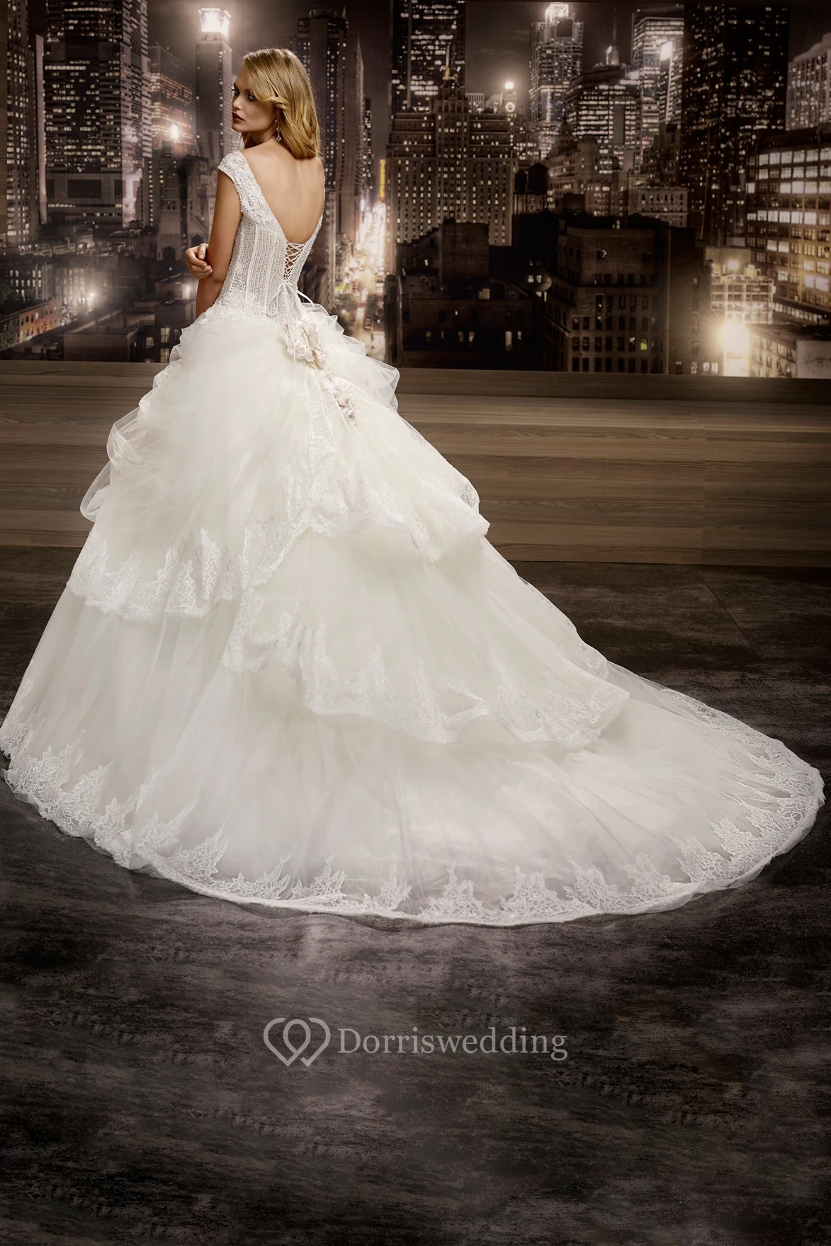 V-neck Floral Cap sleeve Wedding Gown with Lace Corset and Asymmetrical Ruffles and Lace-up Back