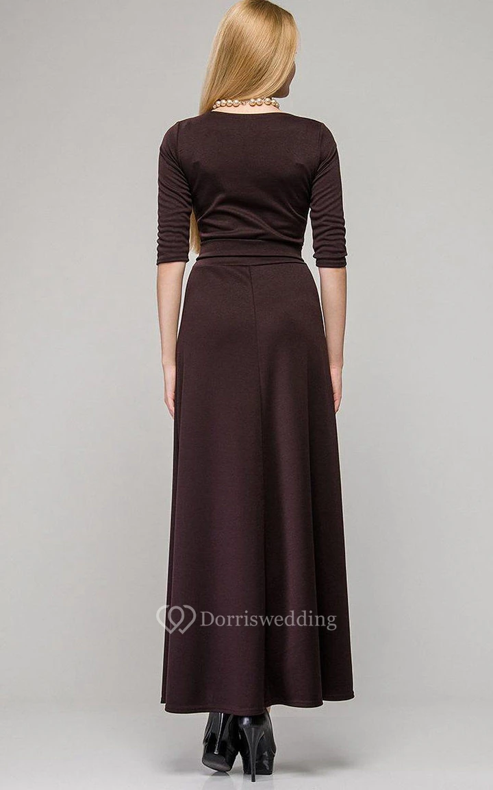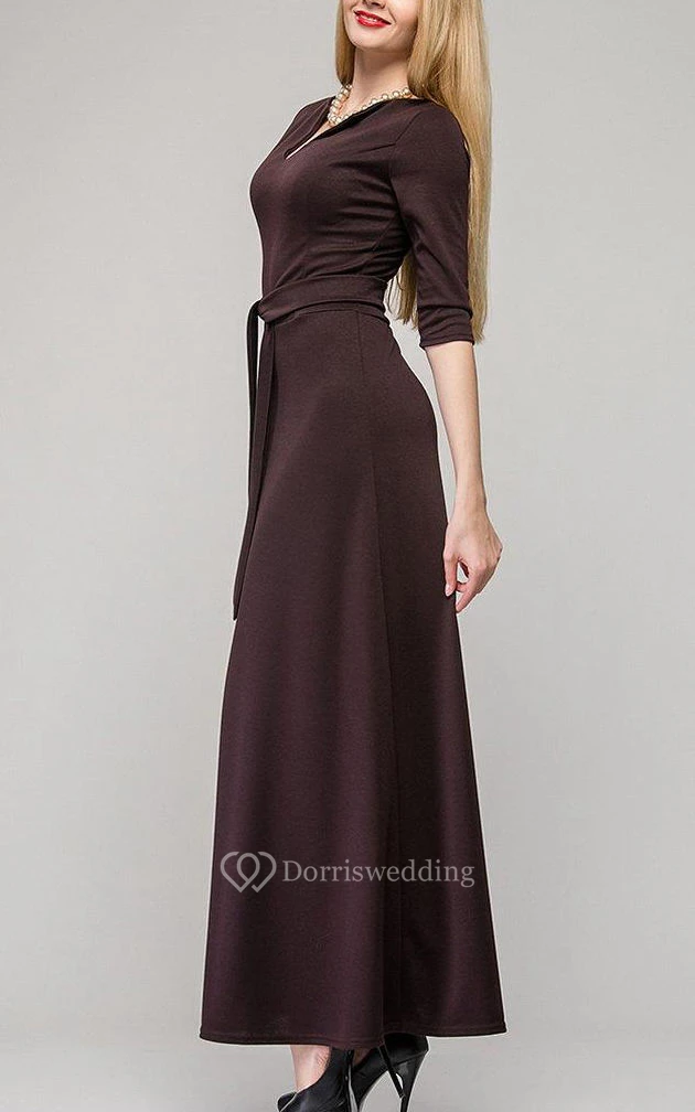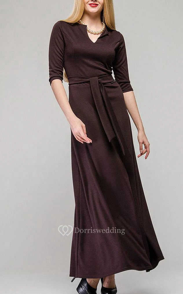 V Neck Half Sleeve A-line Pleated Jersey Ankle Length Dress With Sash