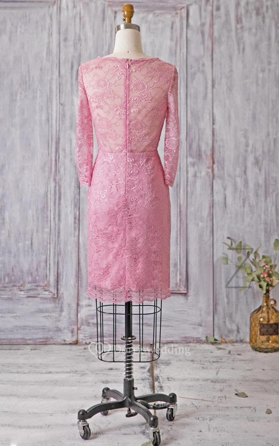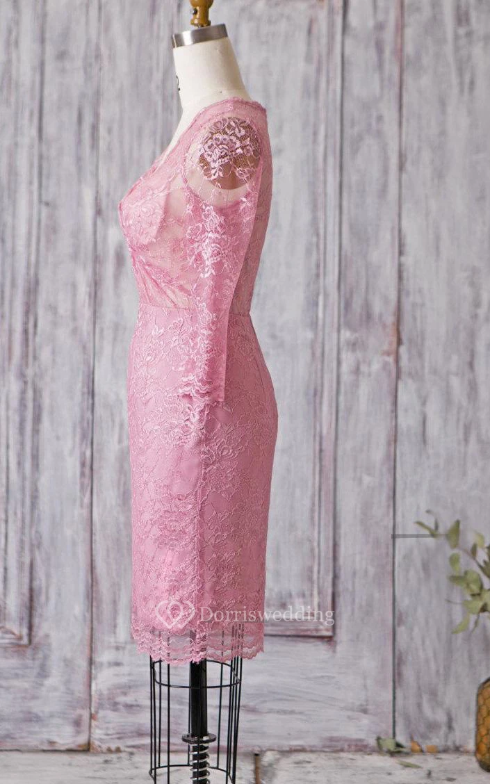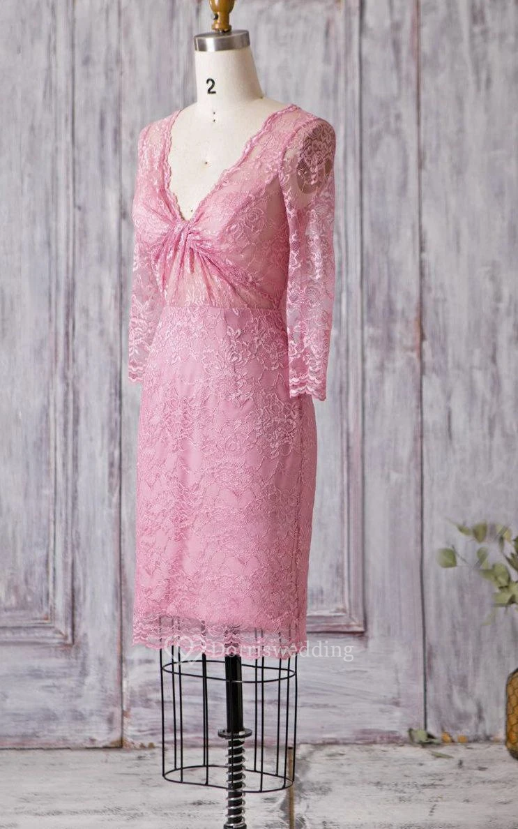 V Neck Illusion 3-4 Sleeve Sheath Lace Knee Length Dress Illusion Style