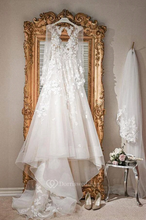 V-neck Illusion Long Sleeve Lace Applique A-line Wedding Dress