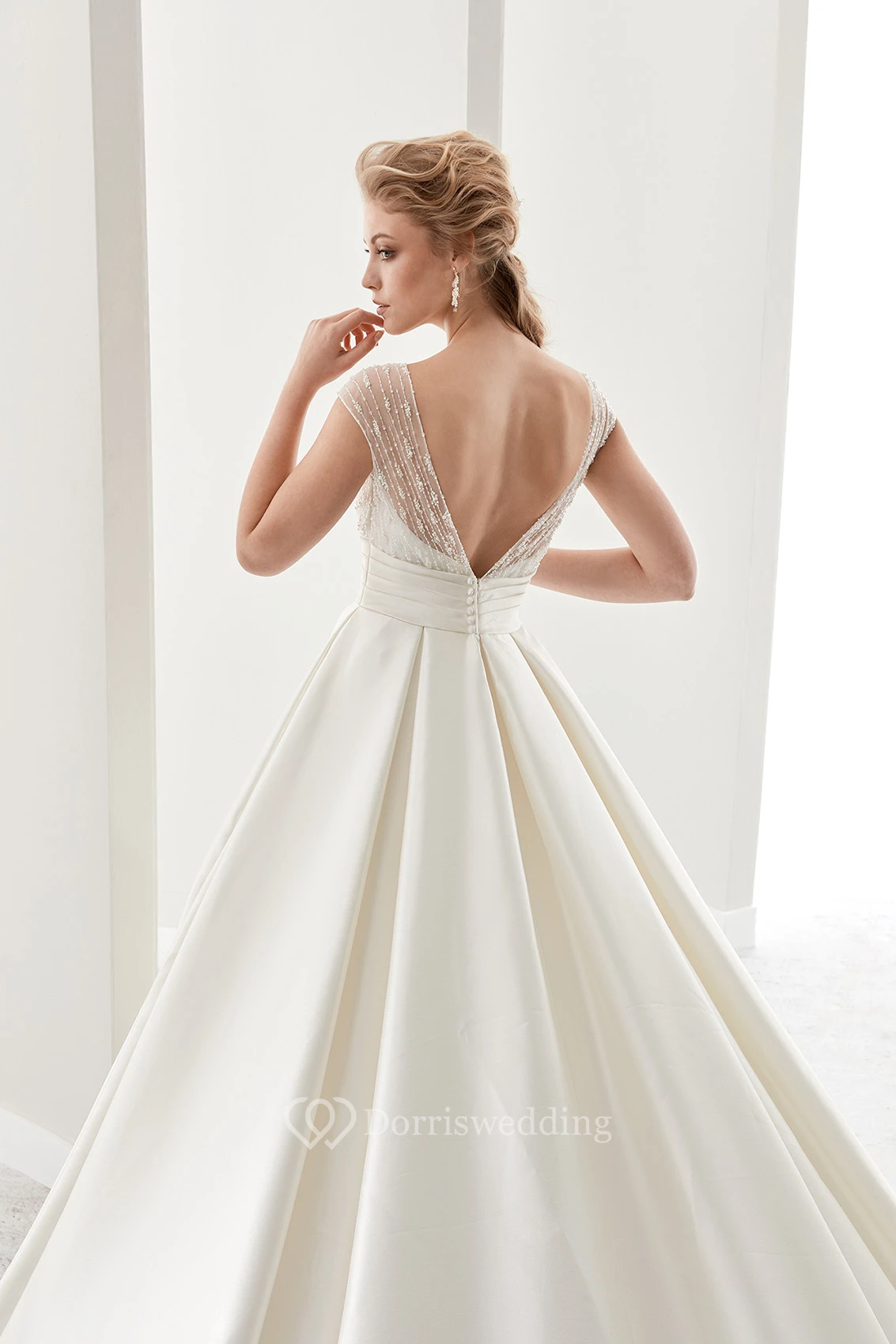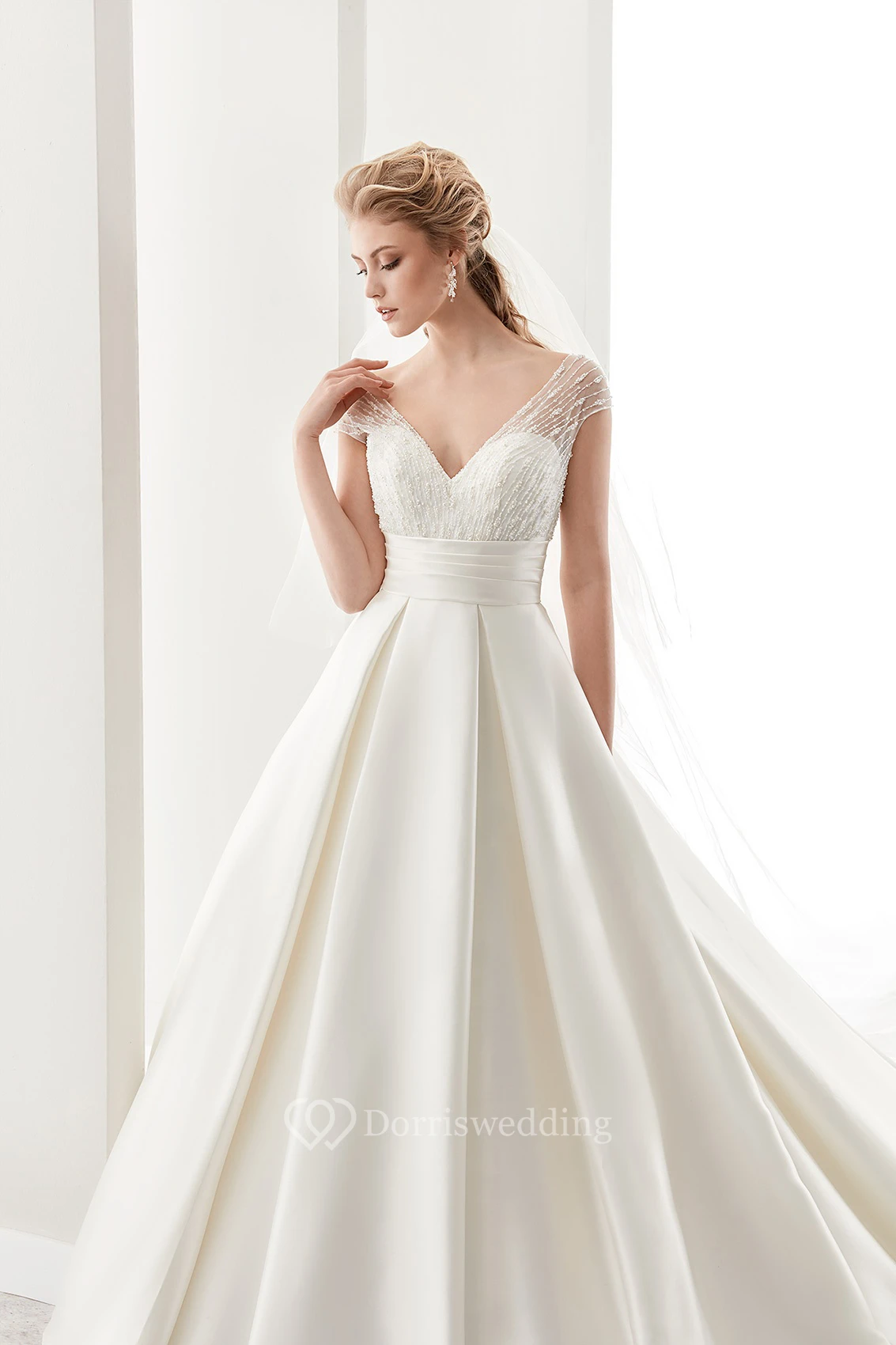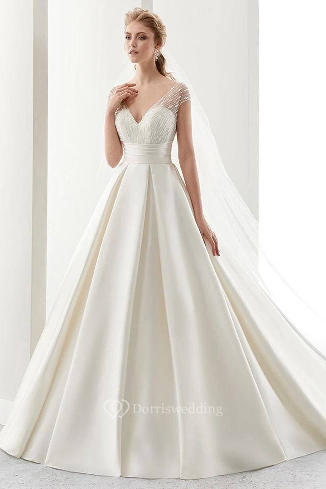 V-Neck Illusion-Strap Satin A-Line Wedding Dress With Cinched Waistband And Low-V Back