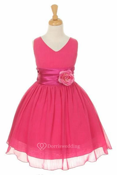 V-Neck Knee-Length Tiered Chiffon&Satin Flower Girl Dress