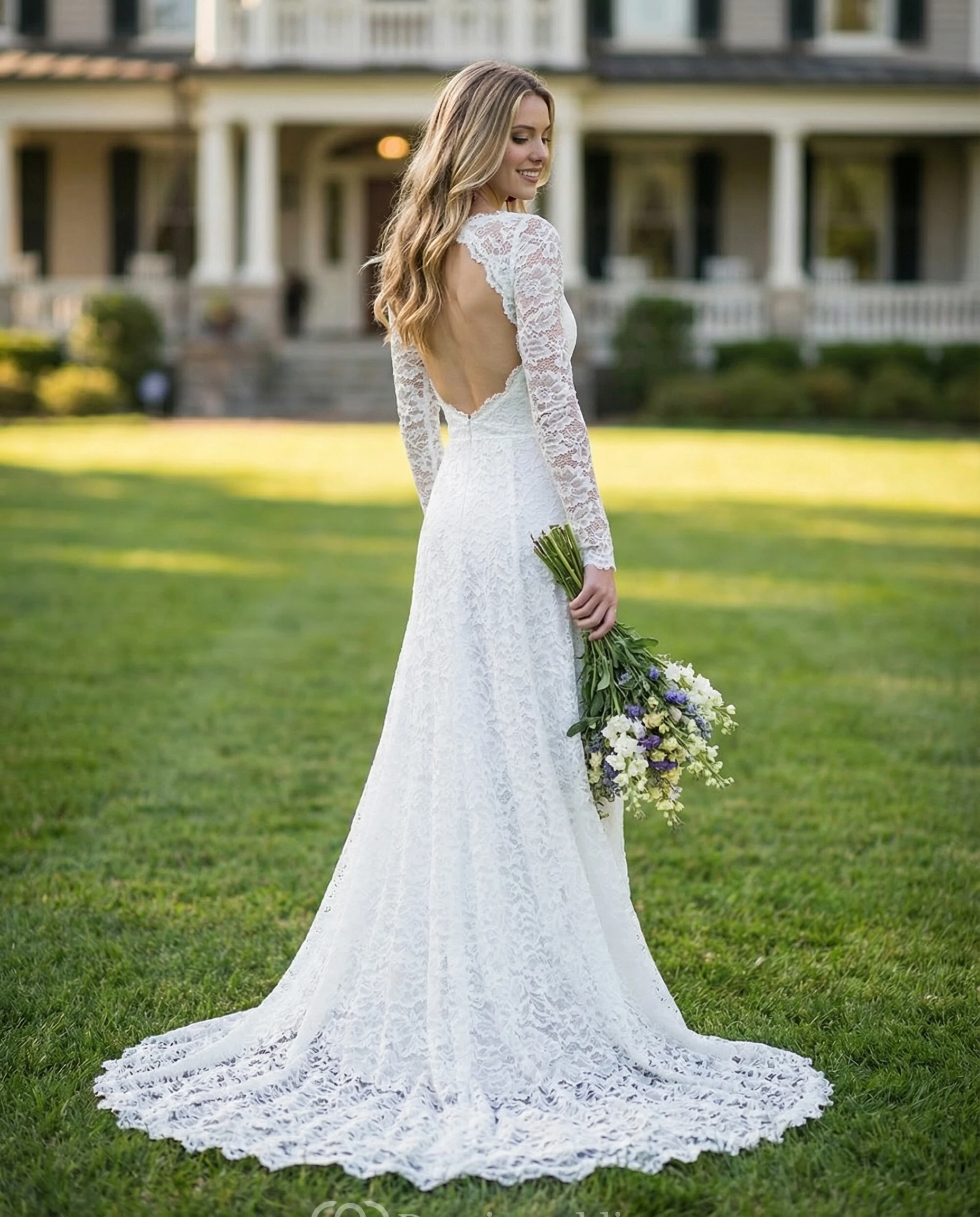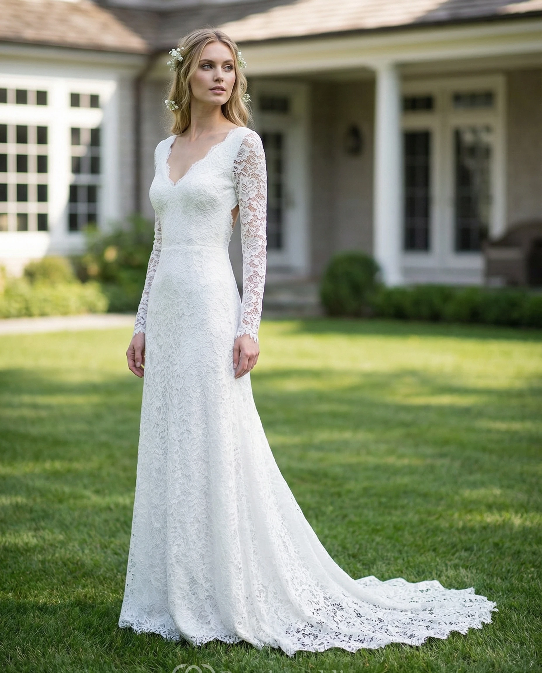 V-Neck Lace A-Line Wedding Gown with Keyhole