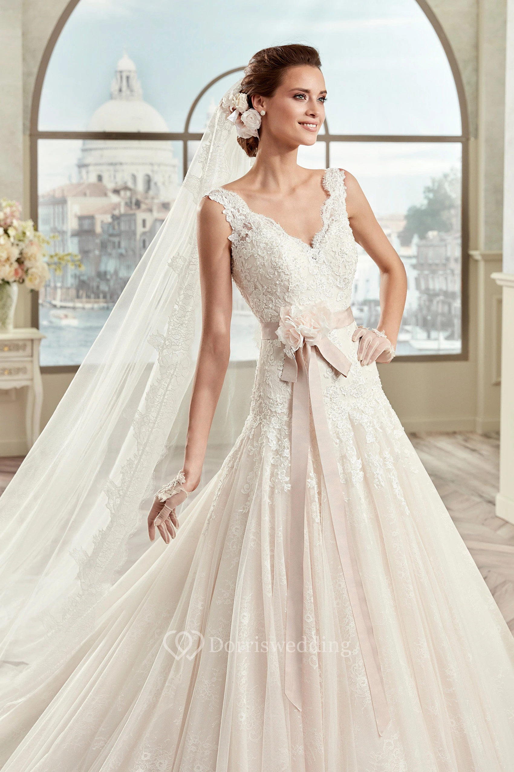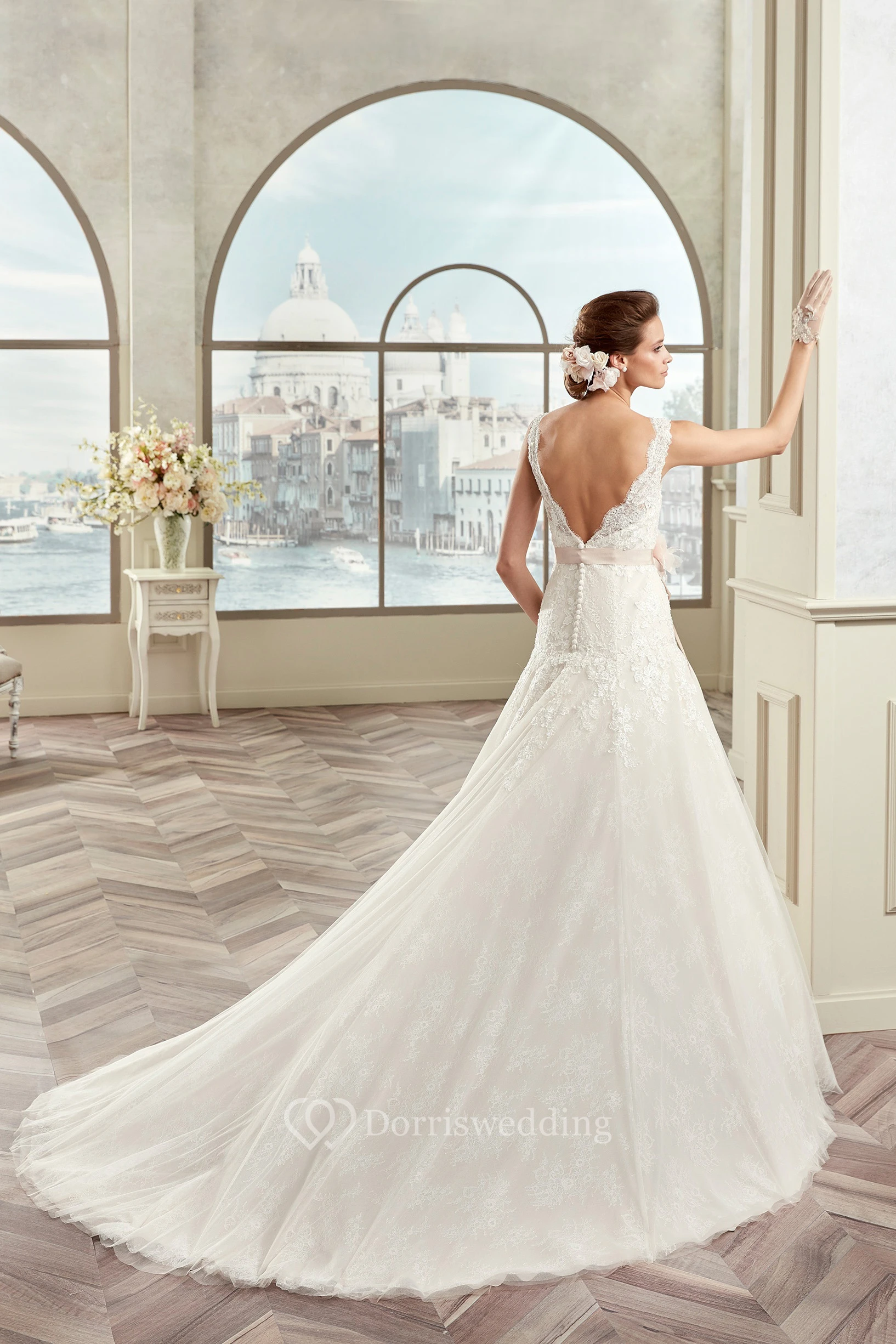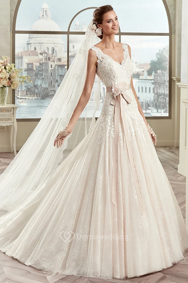 V-Neck Lace Bridal Gown With Floral Sash And Open Back