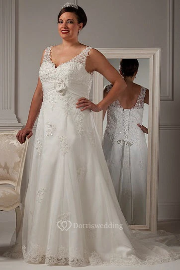 V Neck Lace Bridal Gown With Waist Flower And Lace Up