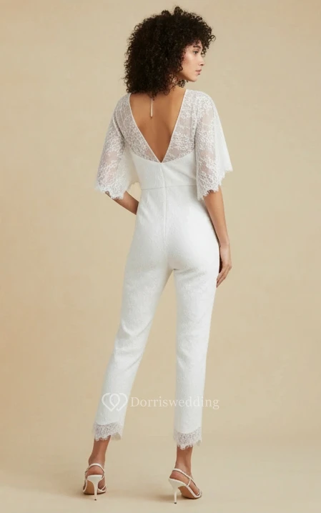 V Neck Lace Cape Wide Leg Wedding Jumpsuit