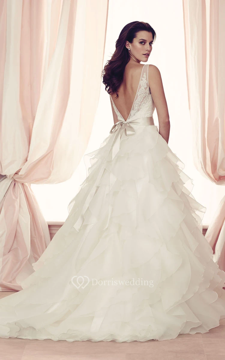 V-neck Lace Dress With Sash And Cascading Ruffles