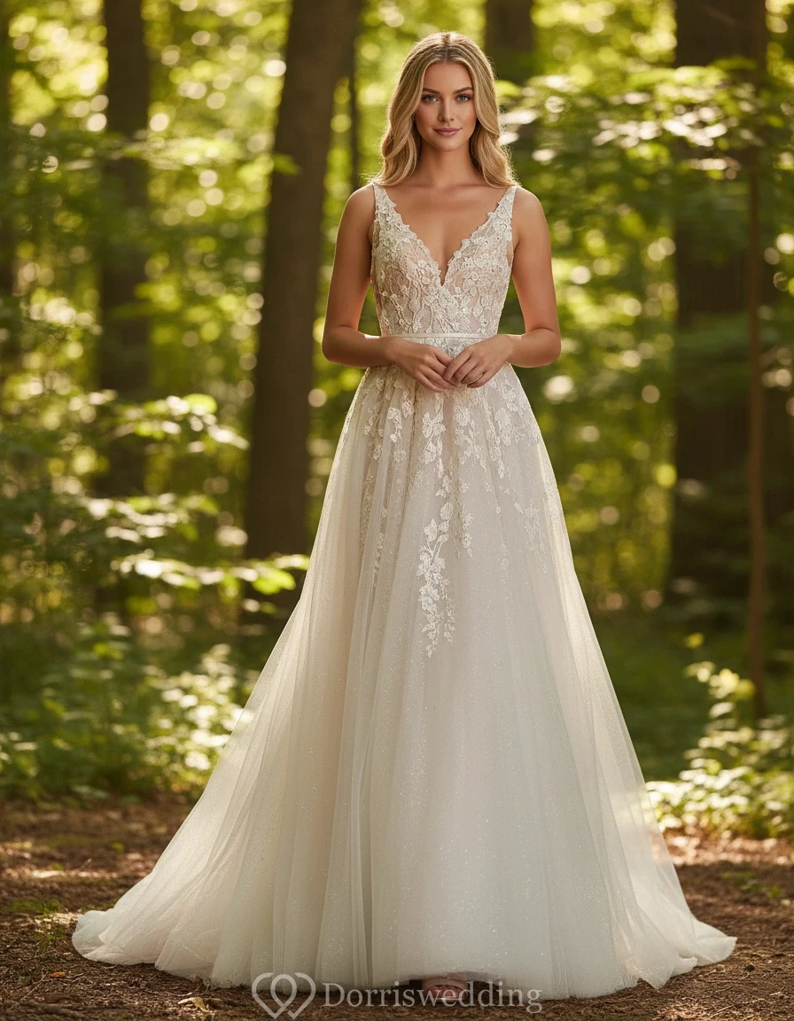 This elegant wedding dress features a V-neckline, lace detailing on the bodice, and a lightweight tulle skirt. Photographed in a lush green forest with soft light, it creates a peaceful and romantic ambiance. Ideal for a forest wedding, it emphasizes grace and natural beauty in a serene environment.