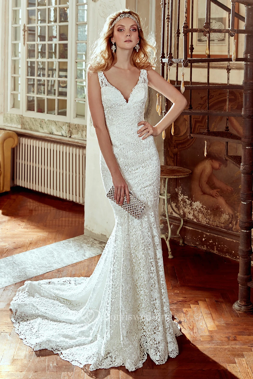 V-Neck Lace Wedding Dress With Brush Train and Open Back
