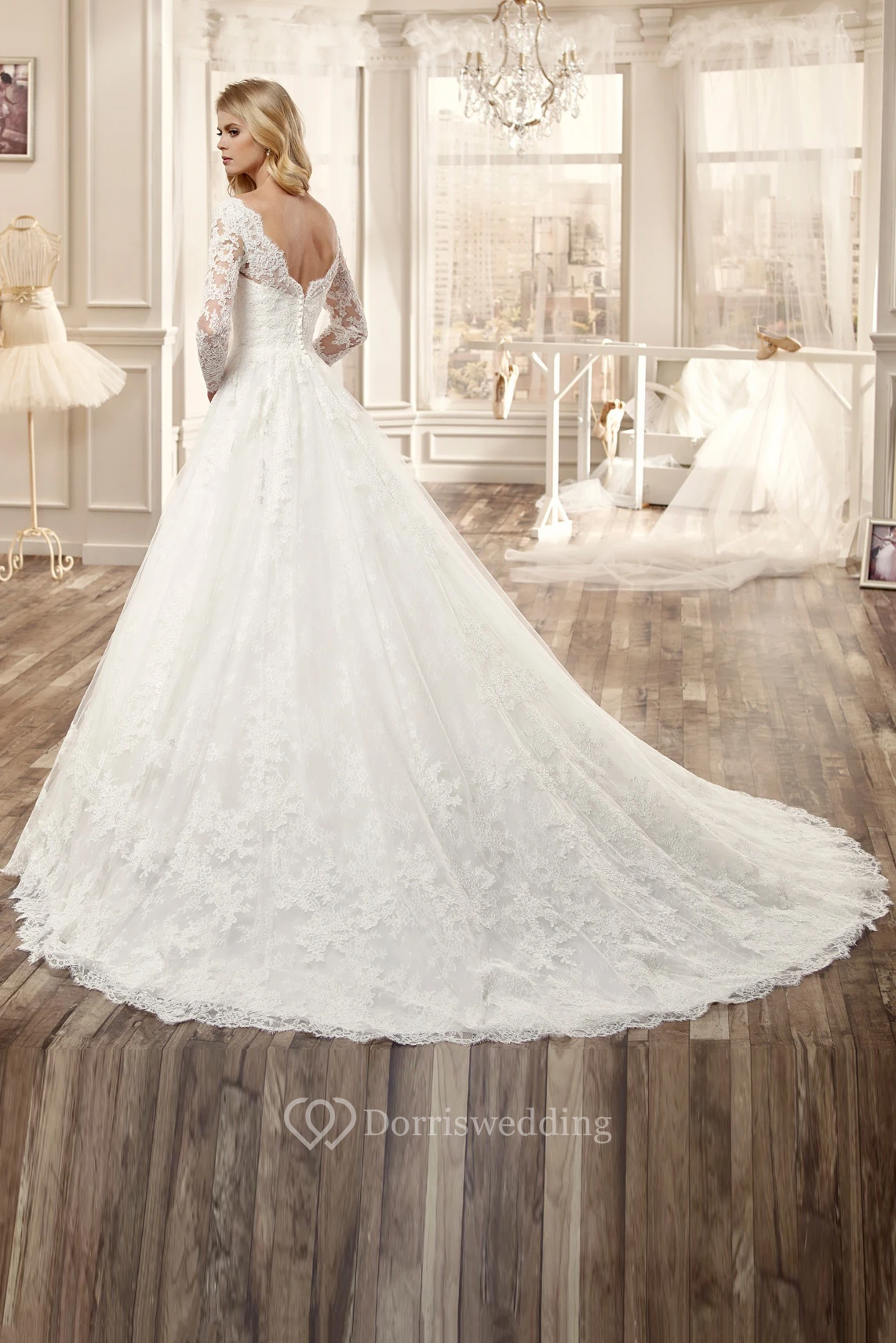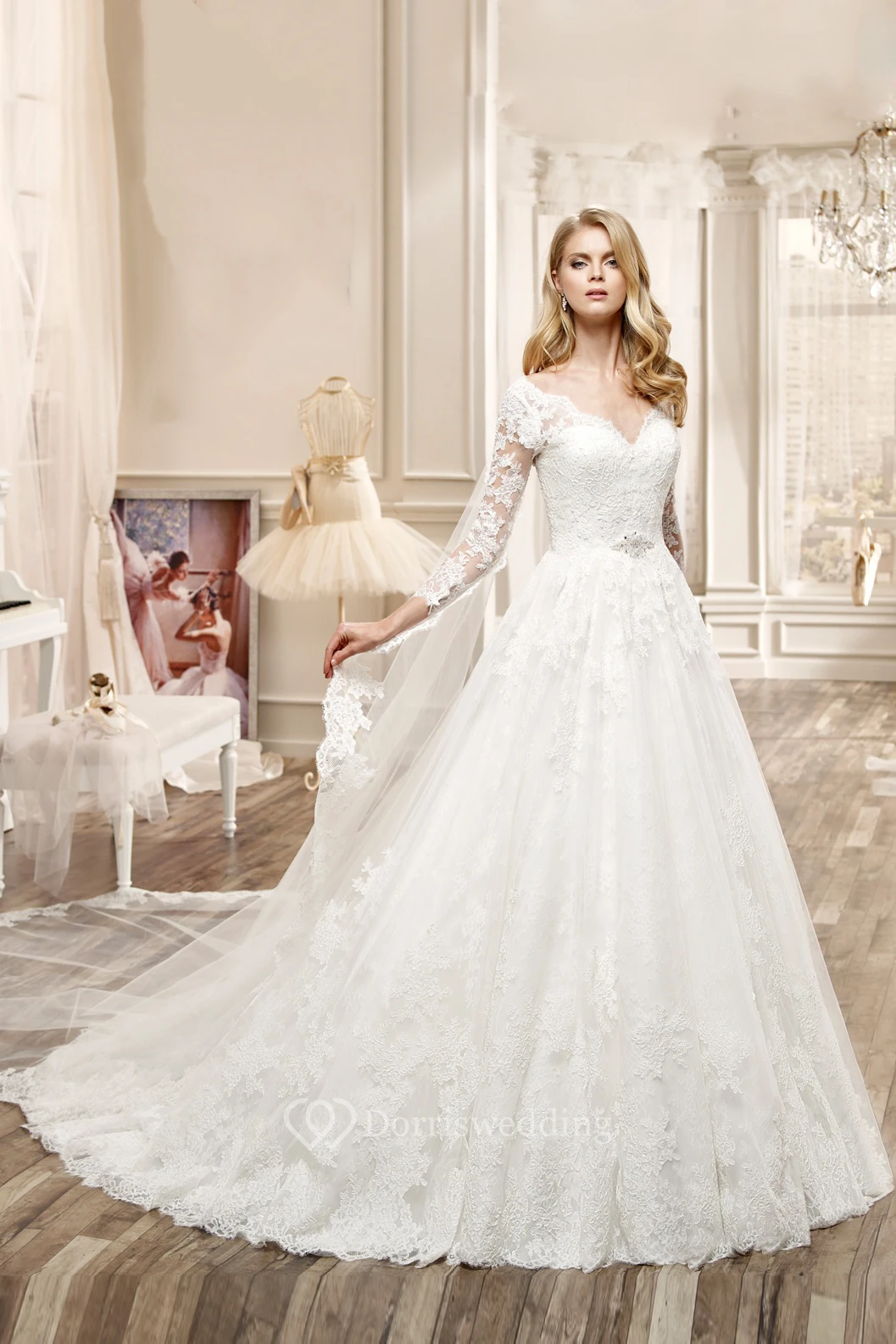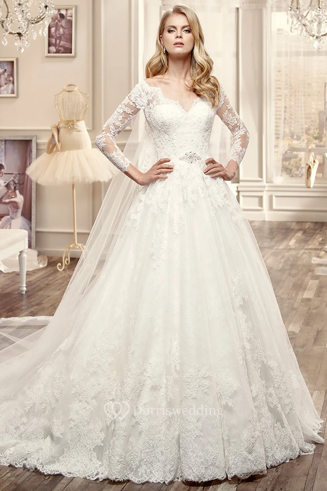 V-Neck Lace Wedding Dress With Long Sleeve And Pleated Skirt