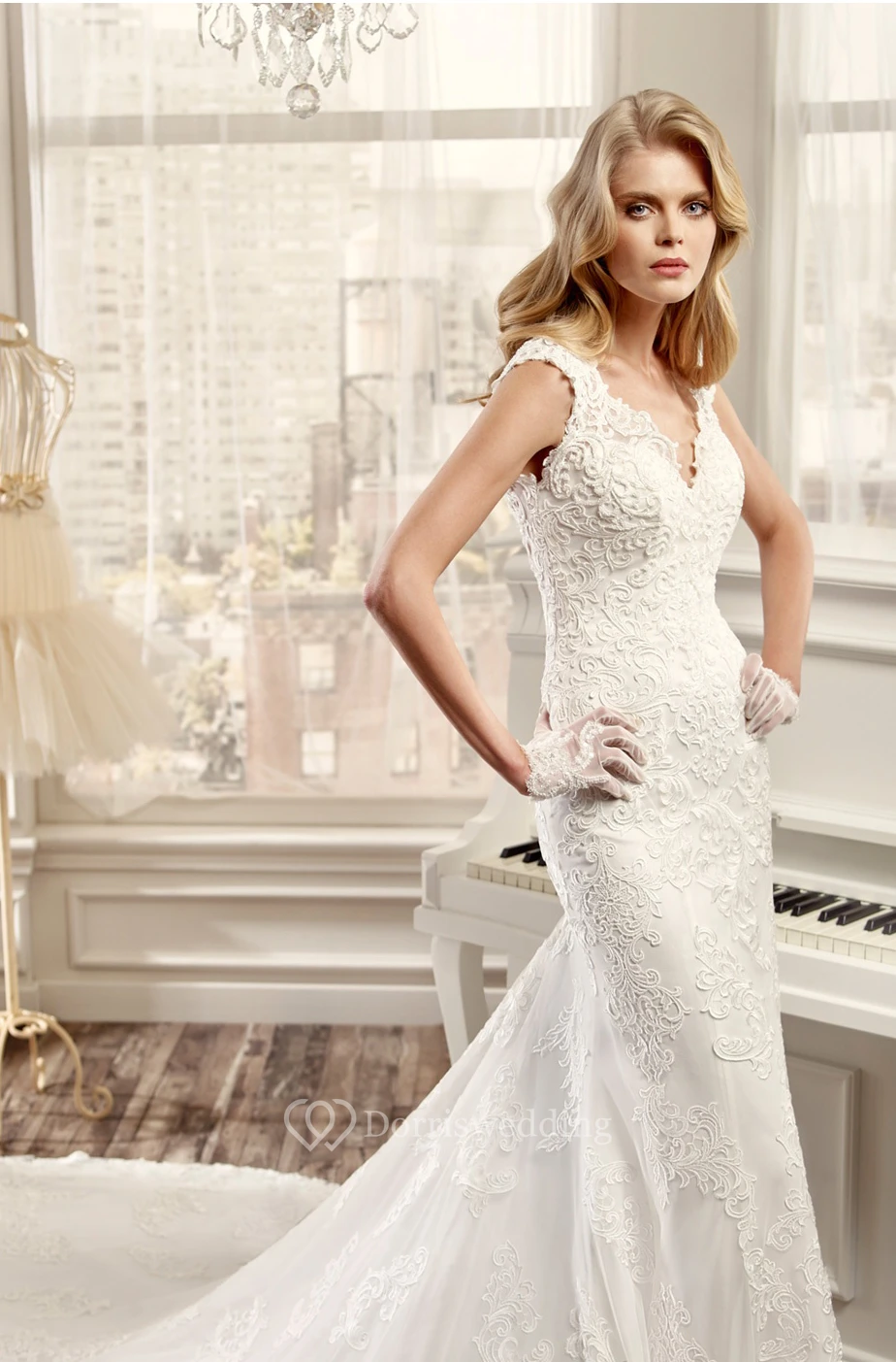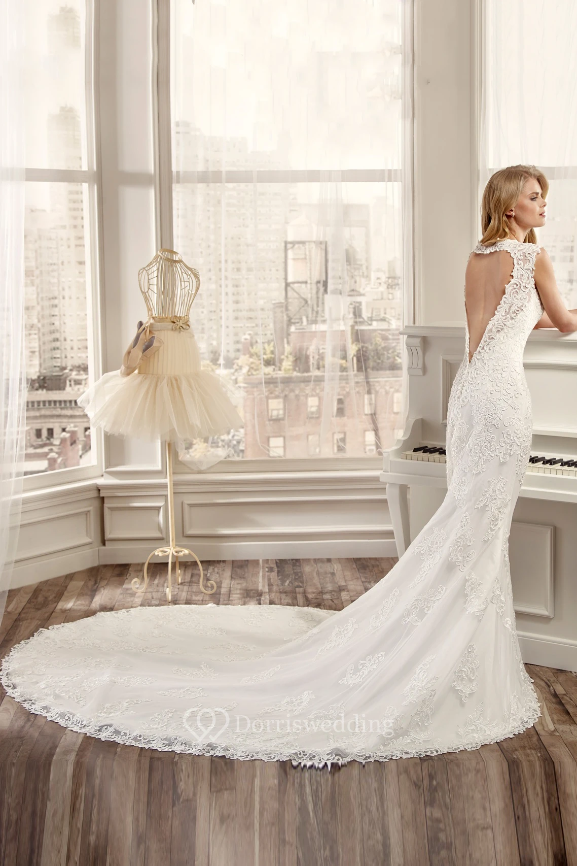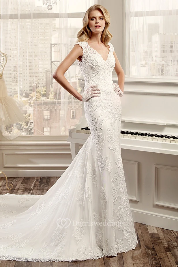V-Neck Lace Wedding Dress With Open Back And Court Train