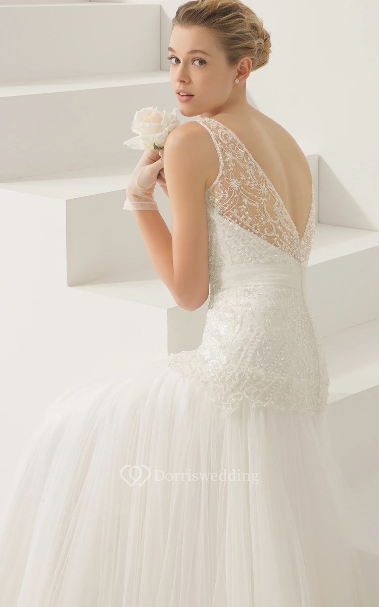 V-Neck Lacy Bodice V Back Illusion Back Gown With Ruffles