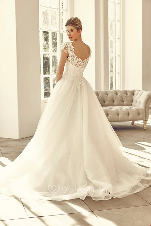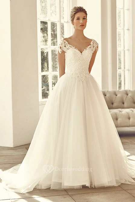 V-Neck Long Appliqued Cap-Sleeve Tulle&Lace Wedding Dress