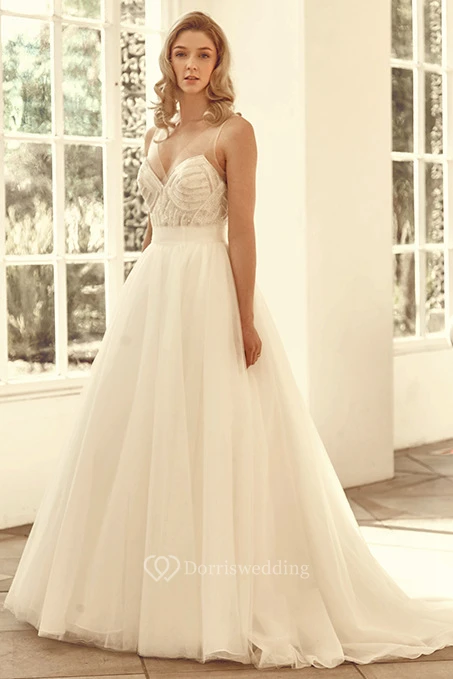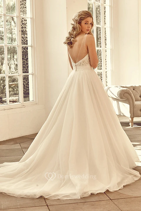 V-Neck Long Beaded Tulle Wedding Dress With Court Train And V Back