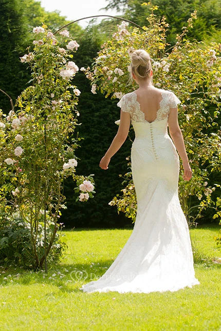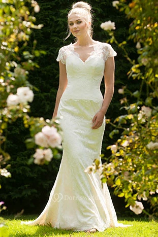 V-Neck Long Cap-Sleeve Appliqued Lace Wedding Dress With Sweep Train And V Back