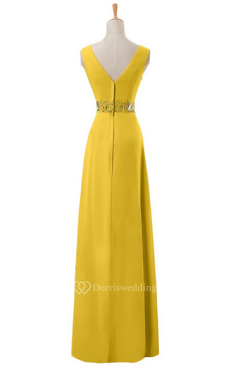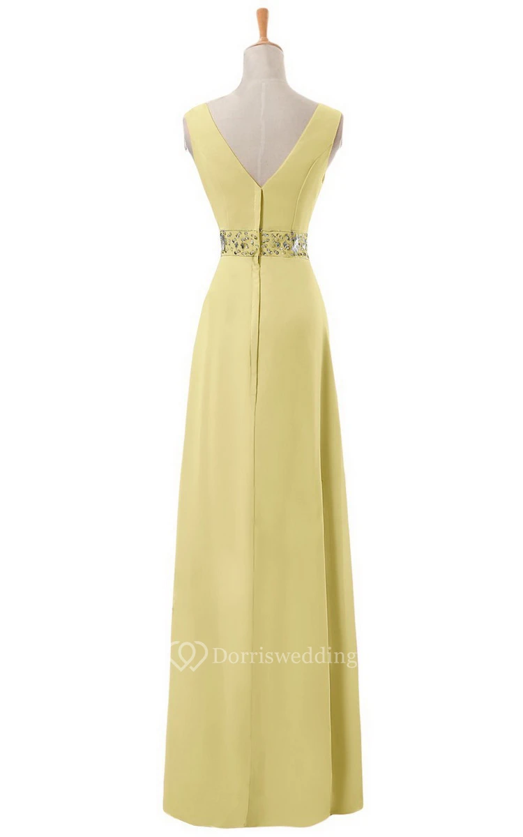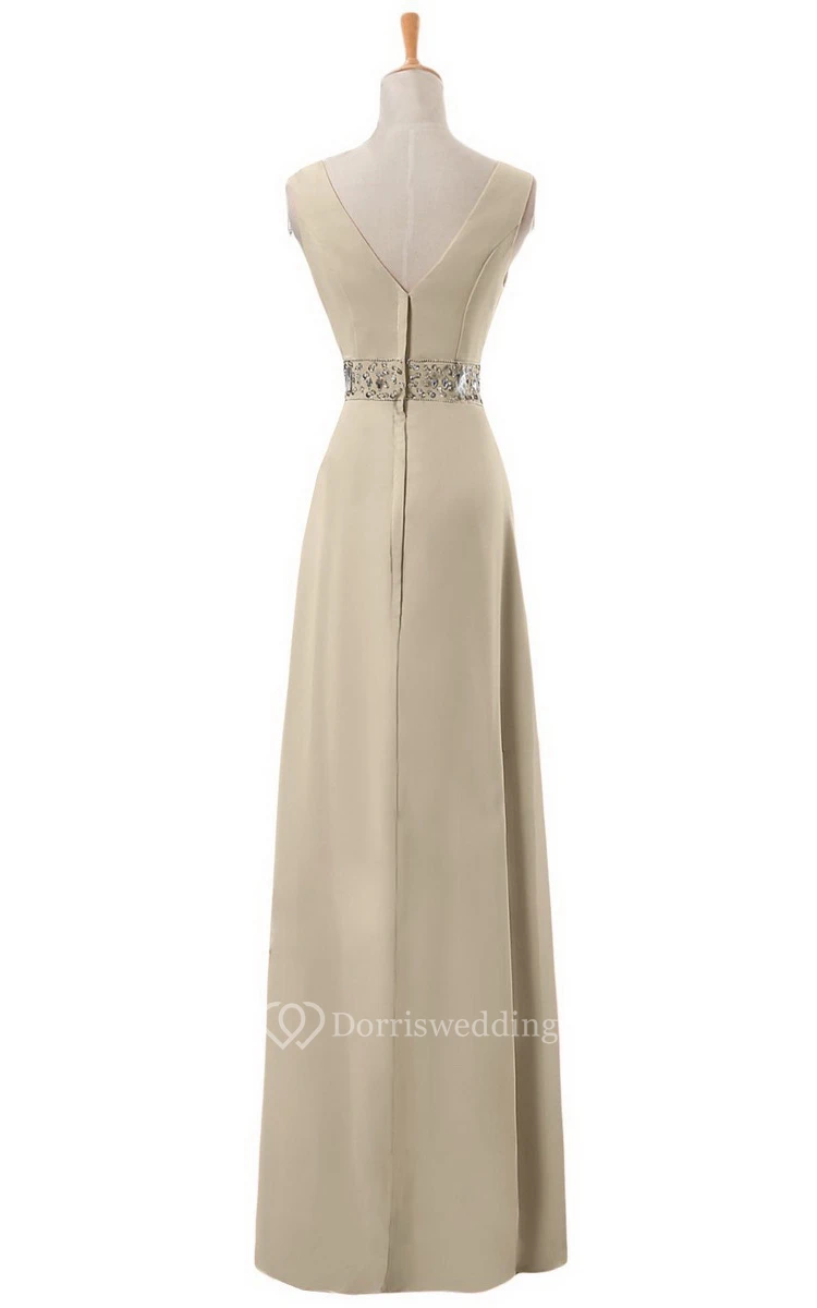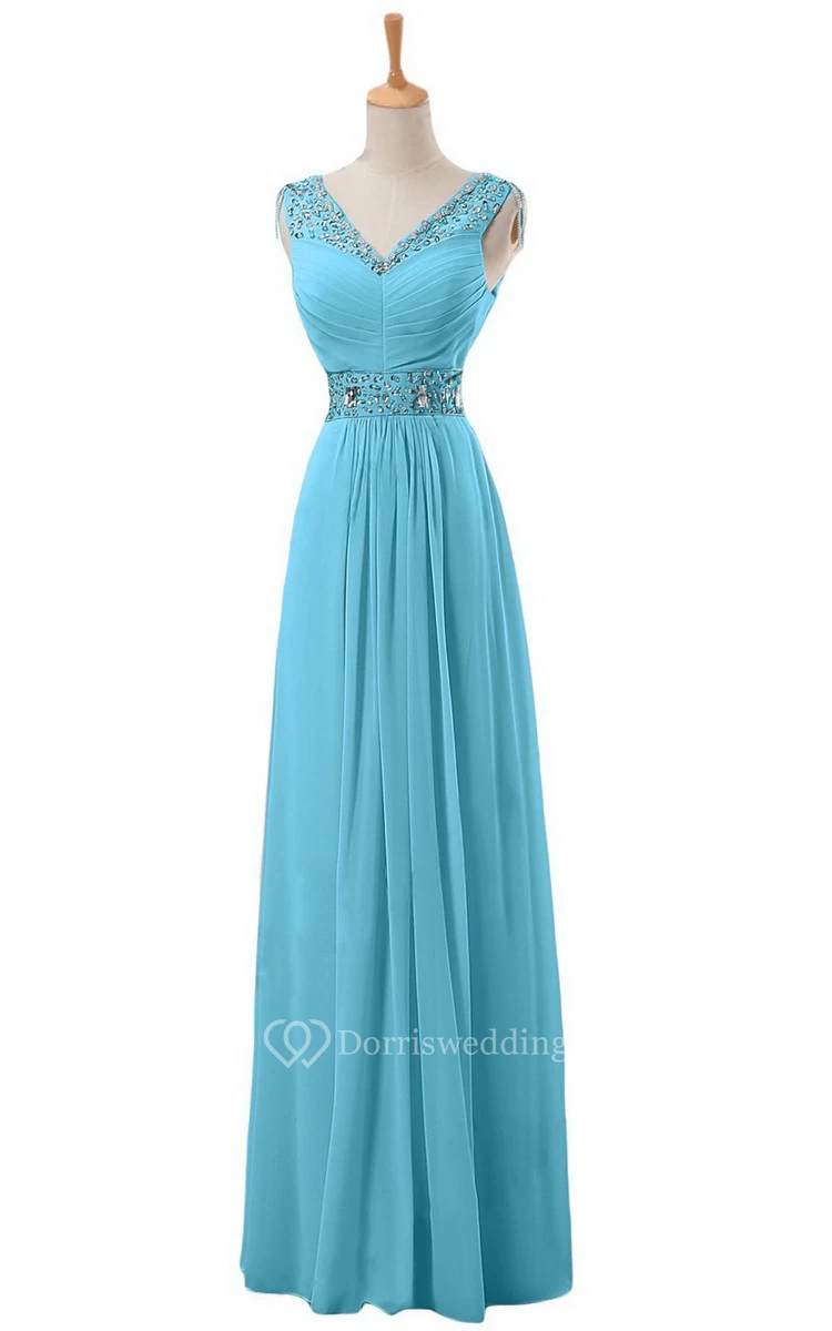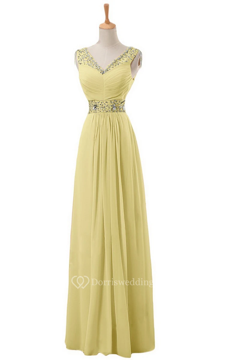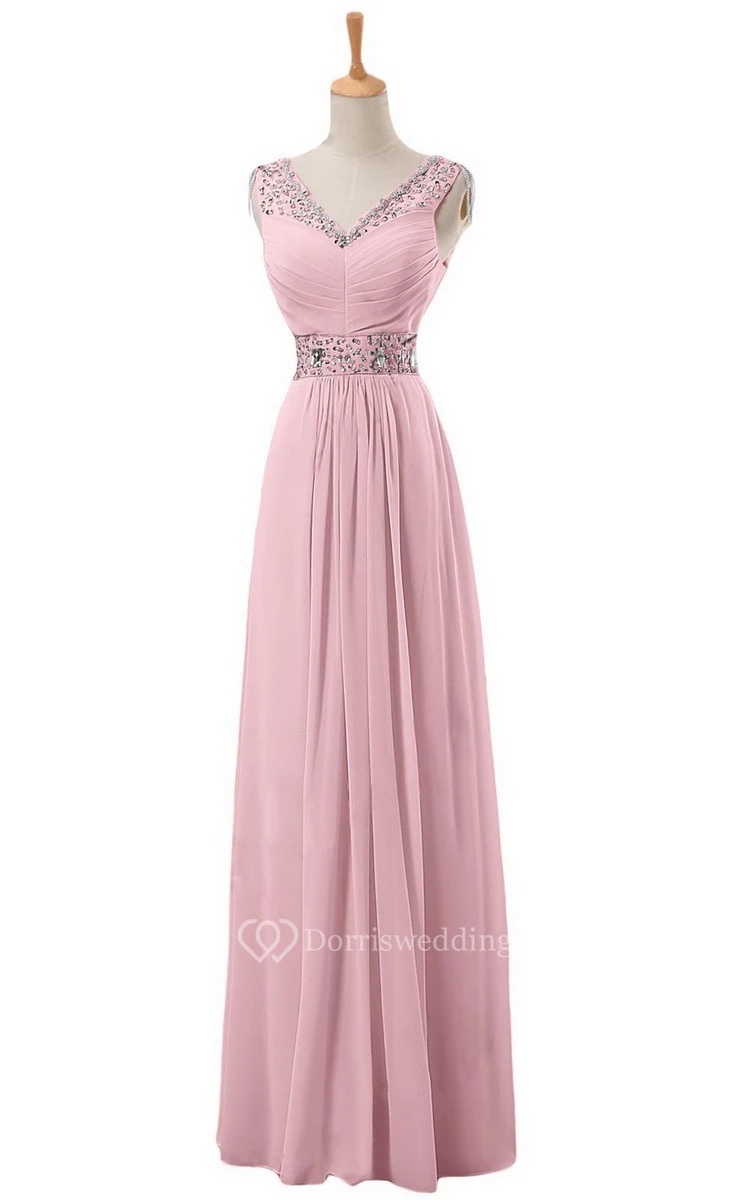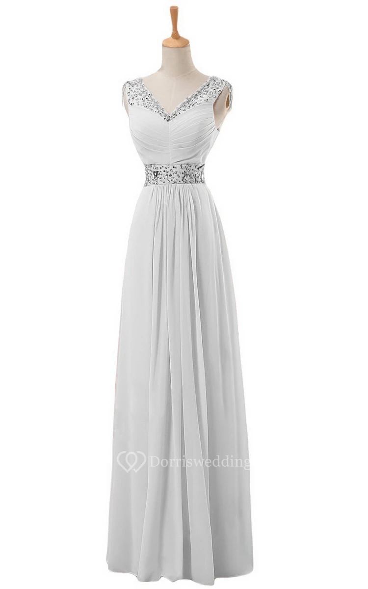 V-neck Long Empire Chiffon Dress With Rhinestones