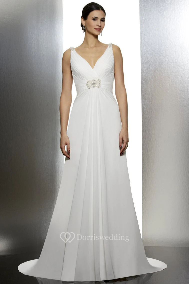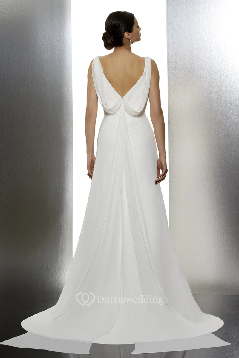 V-Neck Long Ruched Chiffon Wedding Dress With Sweep Train And V Back