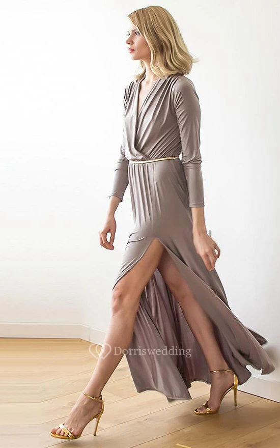 V Neck Long Sleeve A-line Jersey Long Dress Side Split