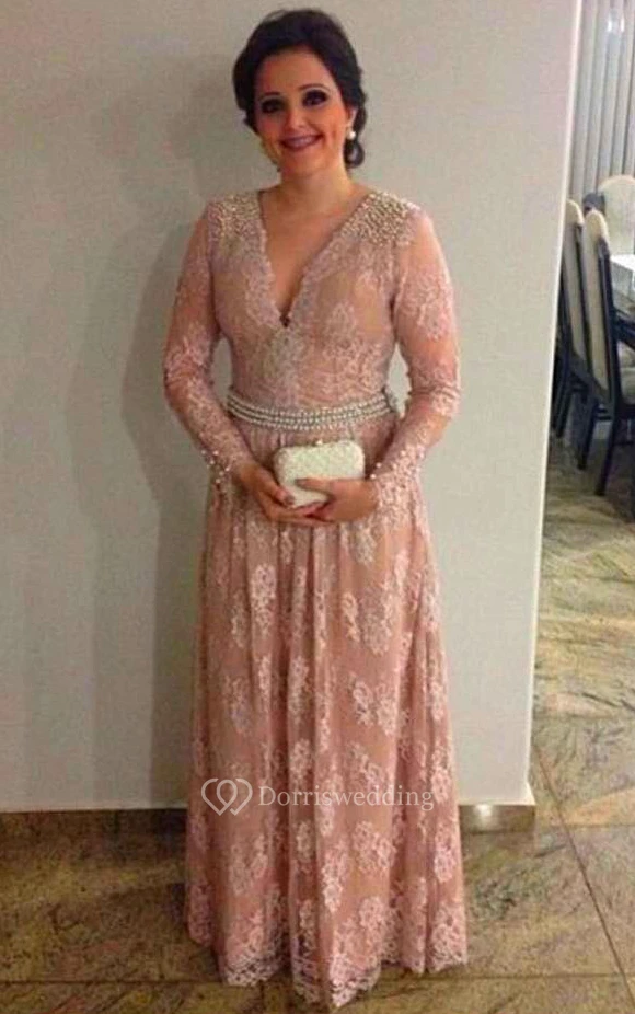 V Neck Long Sleeve A-line Lace Long Dress With Pearl Waist