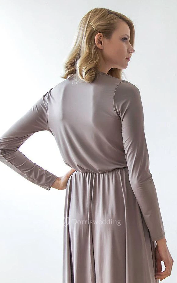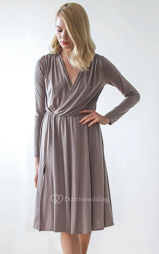 V Neck Long Sleeve Jersey Knee Length Dress With Side Split