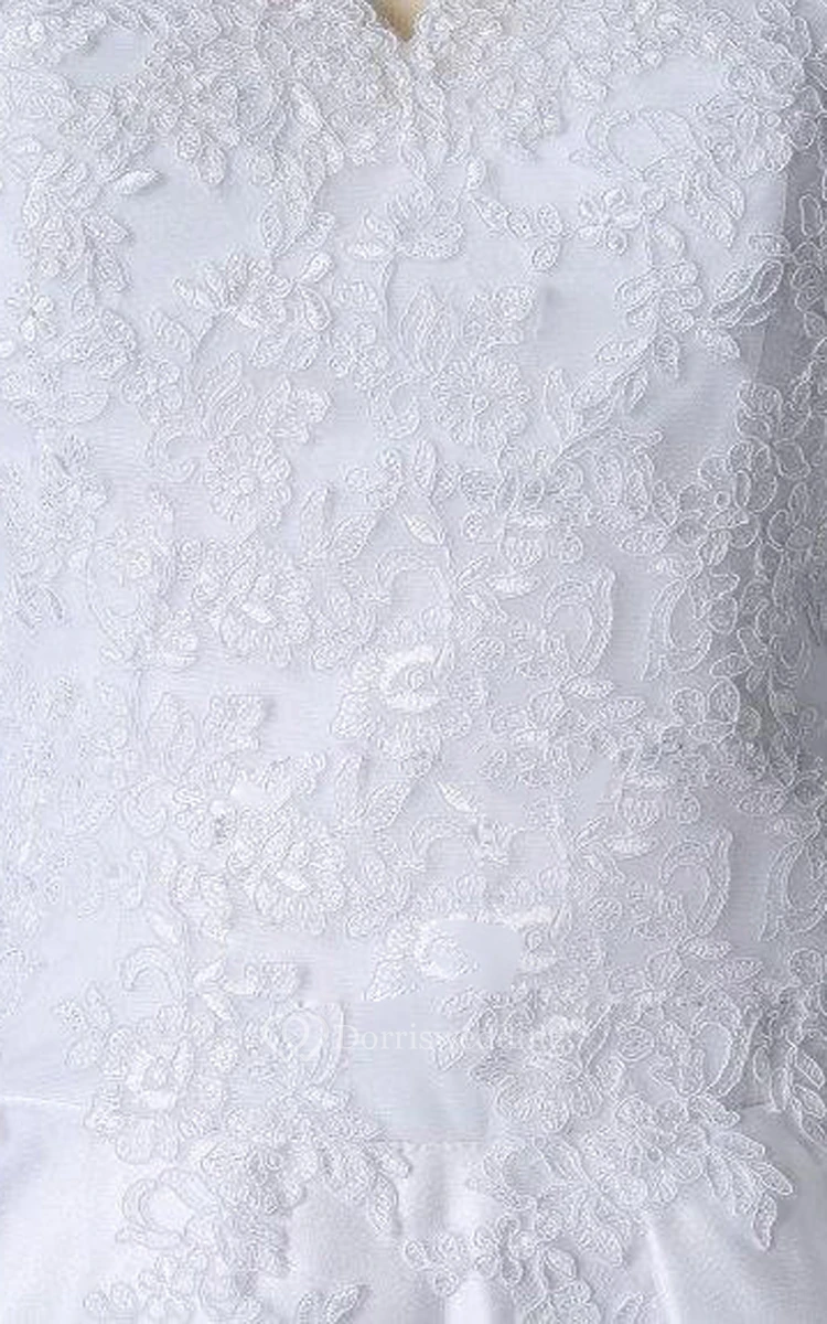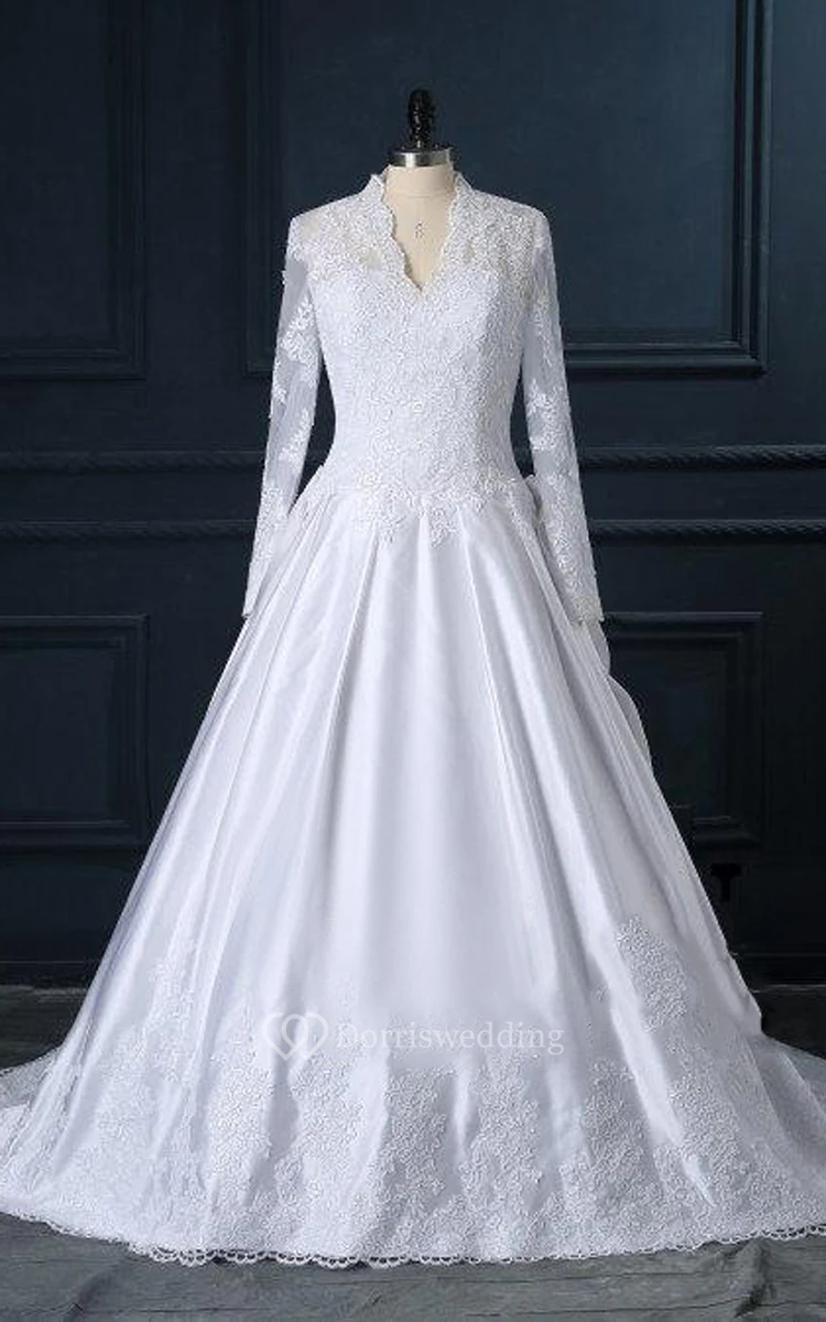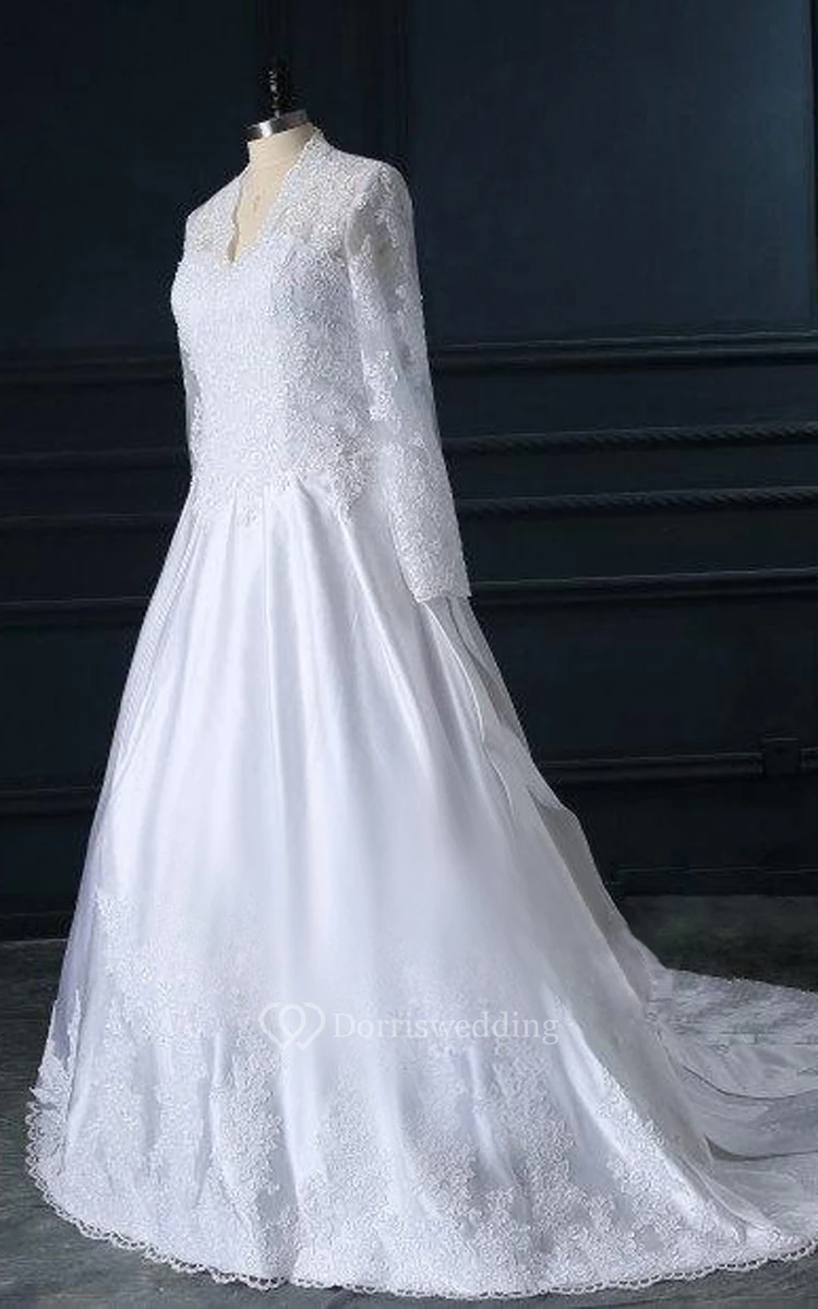 V-Neck Long Sleeve Lace Weddig Dress With Button